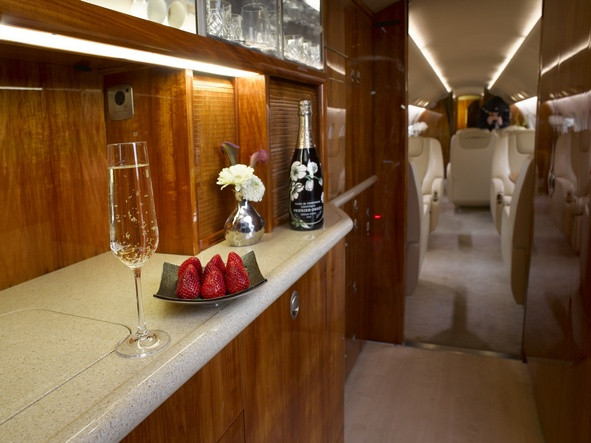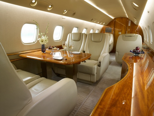 Fwd Zone: 4 Club Seats, 4 Place Conference Group Opposite a Storage Credenza, Partial Bulkhead Transitions to Aft Zone: Berthable Divan Opposite 2 Seats