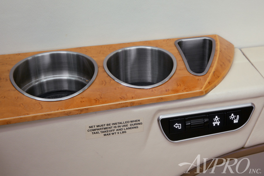 Fireblocked double-club main cabin configured floorplan certified for nine passengers including the belted lavatory seat located aft of the main cabin. This stylishly appointed interior features Ecru (light beige) leather seating surfaces and side ledges with Tobacco (darker beige) accents; complimented by Cream colored seat belts. An Almond Ultra-Leather headliner and cockpit curtain further compliment the cabin soft goods; as does the overall darker grey patterned carpeting. The forward refreshment center/Galley, drink-rails and fold-out tables are all finished in a High Gloss Birdseye Maple complimented by a soft Satin Nickel plating that runs throughout the cabin and lavatory. Galley amenities include a heated liquid dispenser and a TIA WaveJet microwave oven. The galley and lavatory also feature coordinated Real Rock Slate countertops. Additional cabin amenities also include a forward left-side bulkhead mounted 12” Color Monitor as well as six (6) Pop-Up 7” Monitors/Touchscreens; with four (4) screens at all forward club seats and two (2) located at the aft left-side seating positions. There are also USB Ports at the main cabin seats as well as an HDMI Port at the cabin master seat. The private aft lavatory compartment closes off from the main cabin through use of full-size Birdseye Maple pocket doors.