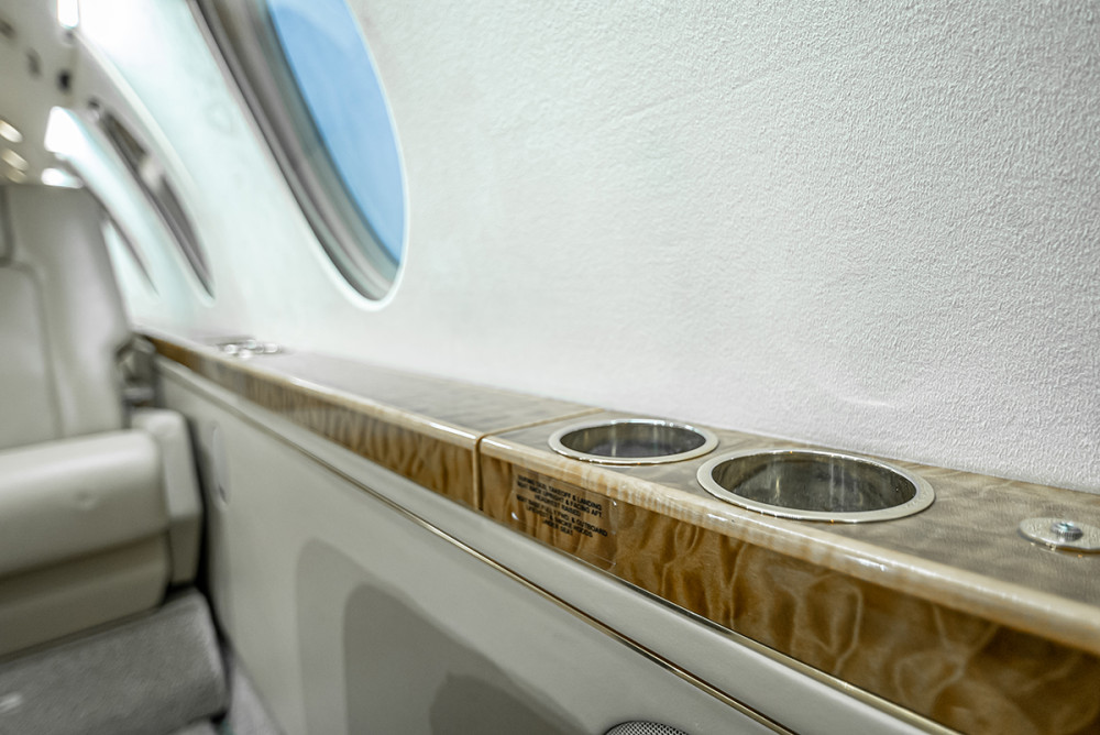 New upper and lower sidewalls and new webbing and foam on seats in 2011. Nine-passenger interior with a forward four-place club and aft two-place club opposite a three-place divan. Falcon 50 interior shell with more interior space than a standard Falcon 20. LED cockpit and interior lights. E.A.R. sound control blanket insulation throughout cockpit and cabin. Falcon 50 entryway handrail. TIA coffee maker.