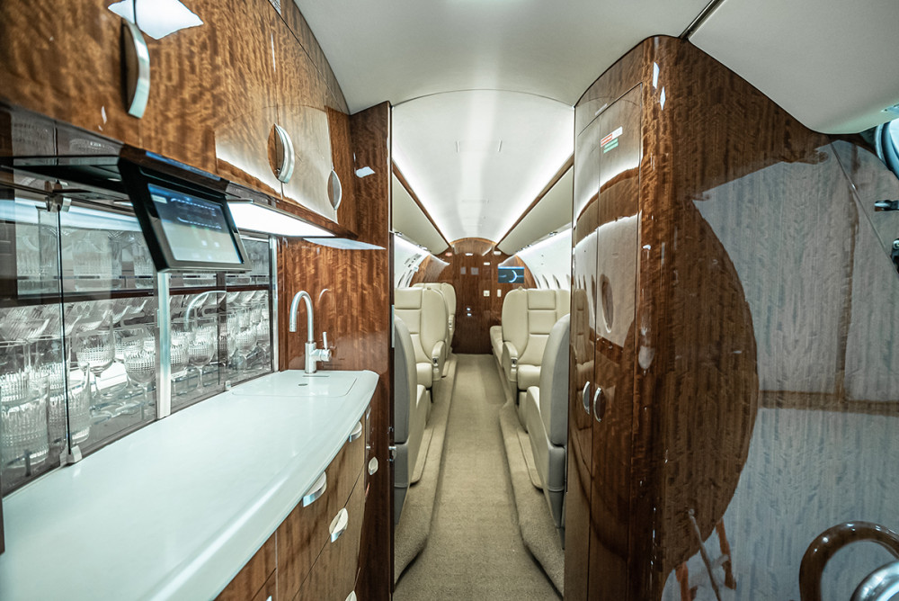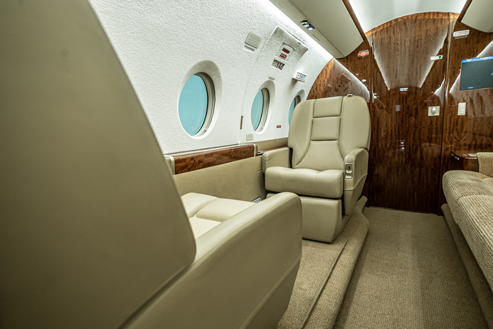 9 Passenger Interior, Forward club configuration with two fold out tables, Aft 3 Place Couch with a Forward and Aft Facing Seat opposite the Couch. Forward Jump Seat. Large Forward Galley with TIA Coffee Maker and Microwave. Forward and Aft Closets. Cabin View Passenger Flight Information System with Dual 19” HD LCD Monitors. Forward Pocket Door.