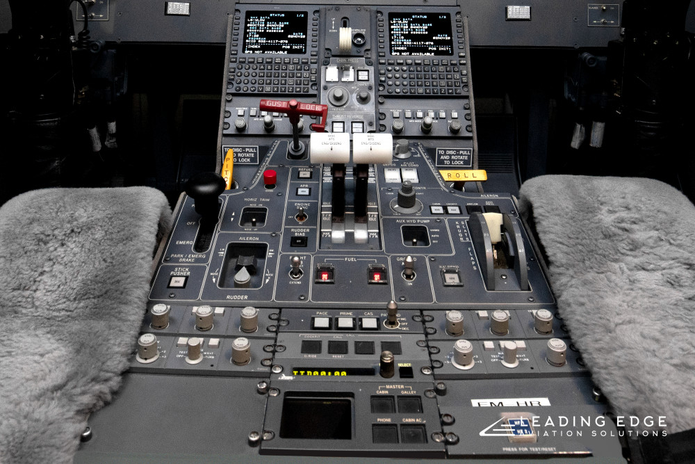 10 passenger. Double club configuration with an aft 2-place berthable divan. Forward seats with full recline and footrests. Pecan leather seats, light beige headliner and dark brown fabric sidepanels. Medium burlwood dual forward executive tables and an aft retracting conference table. Forward & aft hardwood dividers with Airshow cabin displays, entry folding door divider and five 110-volt outlets. Beige carpeting. Forward galley equipped with a microwave oven and coffeemaker, forward storage cabinet. Aft lav with vanity.