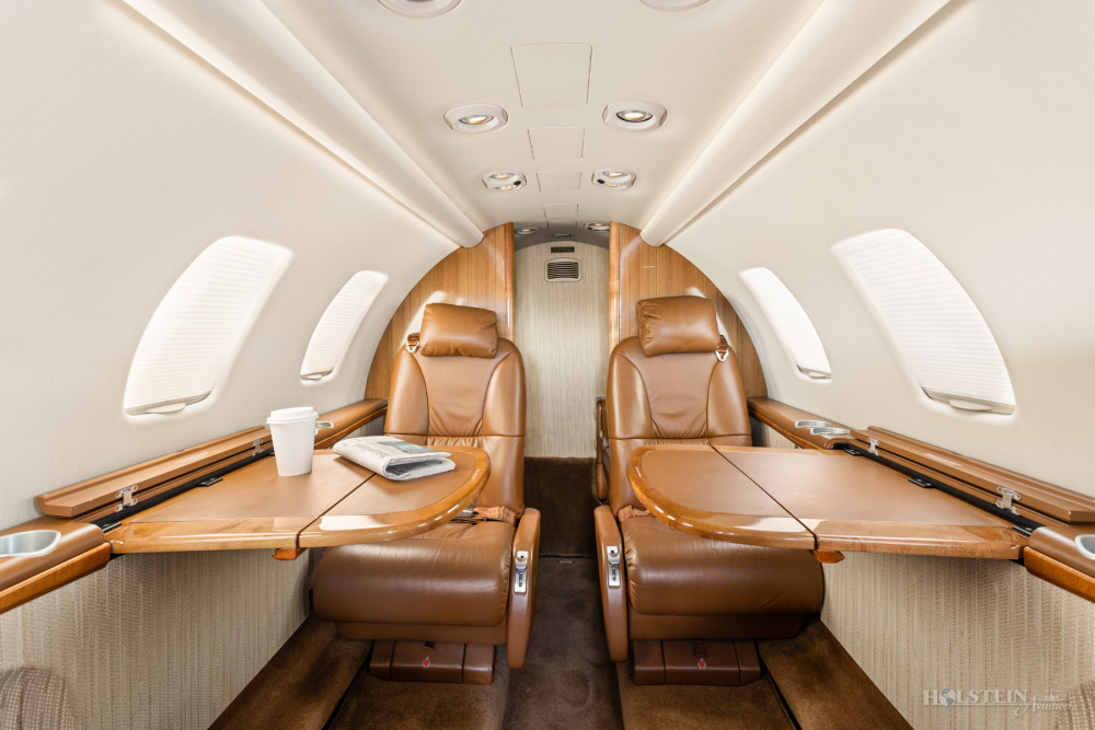 Six (6) Passenger Executive Club configuration in Dark Beige Leather. Fwd side-facing seat and storage. Aft belted and flushing lavatory. Dual writing tables. Natural Teak Gloss laminate throughout. Fwd refreshment center.