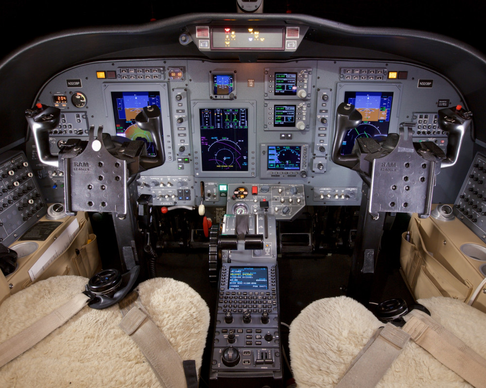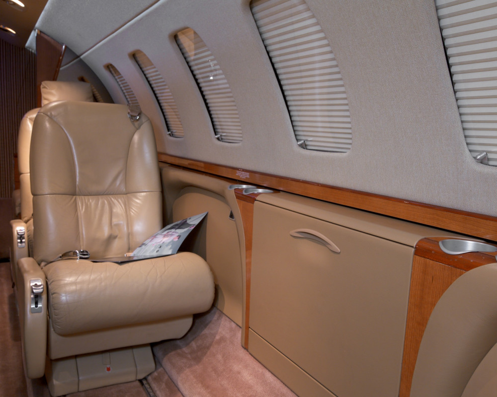 2007 Main Cabin Seating for Seven Passengers arranged in a Center-Club Configuration with a Right-hand Forward Side Facing Seat. Overall Beige Color Scheme. Cabinetry is Cherry Gloss Laminate with Brushed Aluminum Hardware, Belted, Flushing Toilet, Right-hand Forward Refreshment Center, Left-hand Forward Storage Cabinet, Executive and Slimline Tables, 110 Volt Outlets, AirCell ST3100 Phone System.