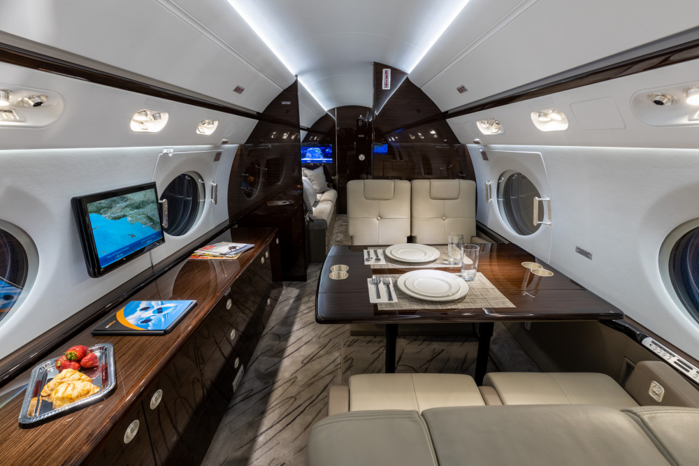 Hallmark Forward Galley/Crew rest, Forward Club Seating finished in Grey Fox Townsend Leather which opens to a Mid-Cabin Conference Grouping opposite Credenza leading to Dual Aft Divans, 24” aft bulkhead cabin monitor, 19” widescreen LCD monitor in upper sidewall panel above credenza, Cabin Audio/Visual Package, Includes 9” Widescreen LCD Monitors in Inboard Armrest of each Single Passenger Seat.