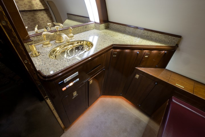 Ten-passenger interior. Forward 4-place club, aft 4-place berthable divan with opposite 2 club. Forward lavatory. Stowable jump seat. Microwave and coffee maker, vanity lighting, Corian countertops and sinks, static inverter with four cabin outlets, DVD/CD player, two Rosen 17-inch Monitors, Interior materials inculde a neutral ultra-leather headliner, ultra-leather window panel covering, and tan 100% wool cut pile carpet. Rich tan leather lower sidewall panels and full grain burgundy leather executive chairs. The divan is covered in Lenis Textiles custom antelope & red rayon chenille fabric. The cabinetry throughout is Platawe Burl MA Veneer with Cherry veneer accents hosing a gloss finish. Corian counters and polished 24k gold-plating throughout. Magnifoam Technology insulation package installed. Skandia over frame blanket installed for a quiet cabin. Aft galley includes a coffee maker, potable water system, glassware storage, china storage, sink, 32-can soda storage dispenser, large cold-storage, and multiple storage drawers for snacks, beverages, ice, and trash. Additional storage opposite galley for china, dirty dishes, microwave, oven.
