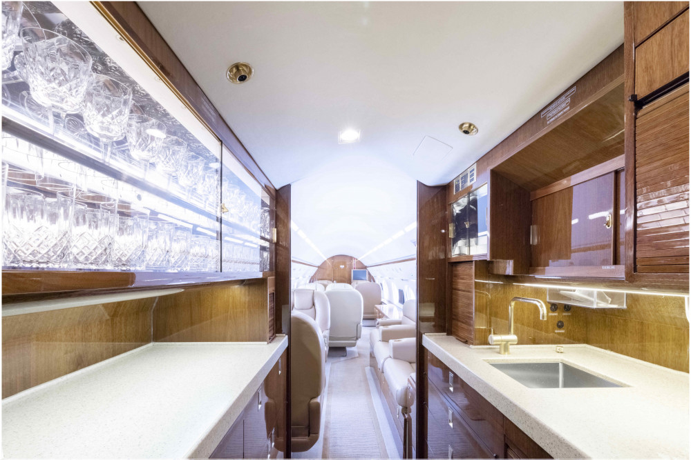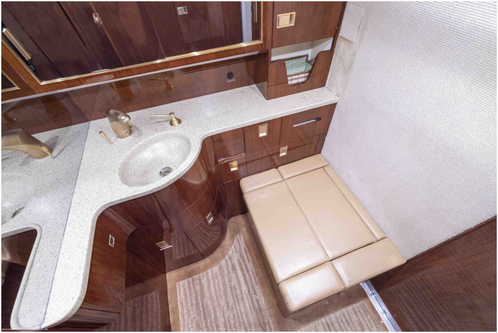 Fourteen (14) passenger configuration. Stunning World Map wood inlay in the entryway followed by a forward four (4) place club. The mid cabin features a four (4) place conference group opposite a credenza with a monitor. The aft cabin offers a two (2) place club opposite a four (4) place divan and a fully equipped galley. Additional cabin amenities include Flight Display swing out monitors, medium colored high-gloss wood veneer complimented by gold colored plating. All seating is completed in harmonious beige toned leather.