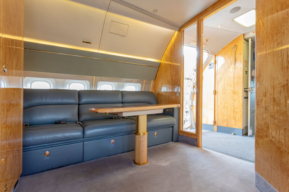 The cabin features seating for 19 with a spacious master bedroom, as well as a guest bedroom, lounge/dining room and office, along with a self-contained crew rest and forward, mid and aft lavatories.