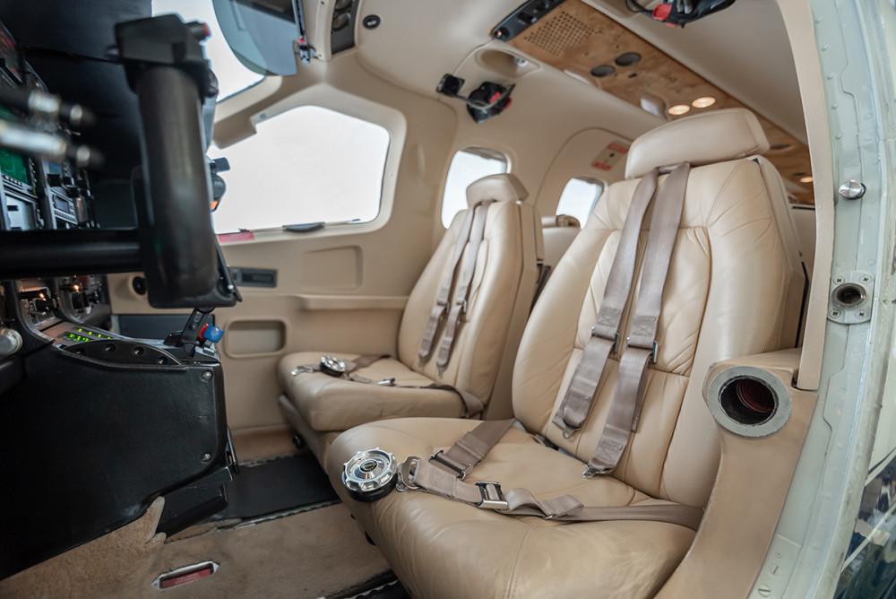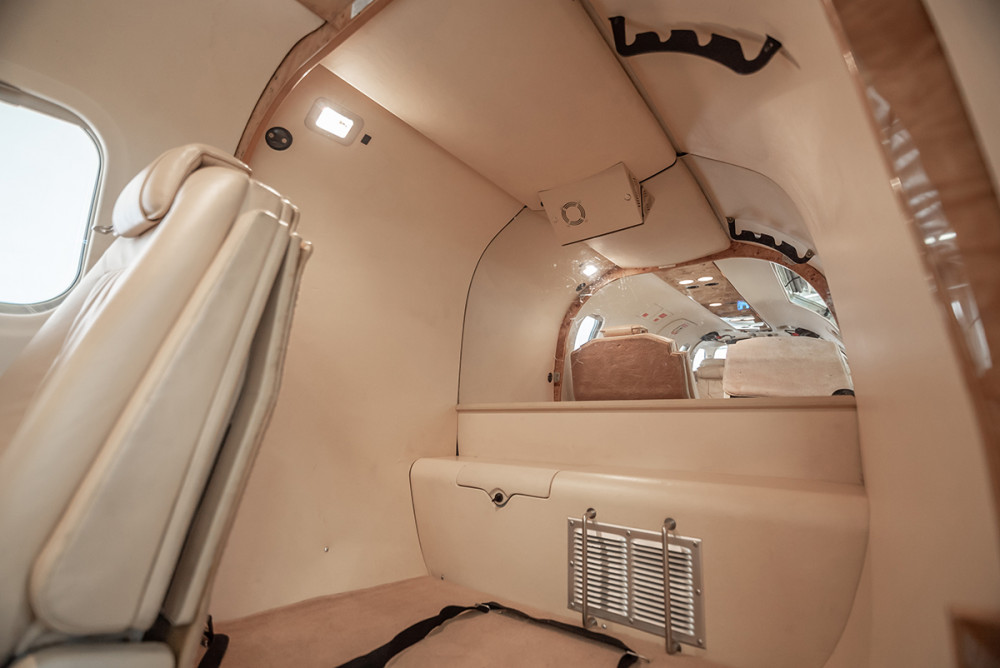 Executive six-seat interior, beige leather seating with beige sidewalls, high-gloss wood trim with retractable working table. It has an entertainment center, overhead panel with A/C vents and reading lights, and Skandia aircraft soundproofing.