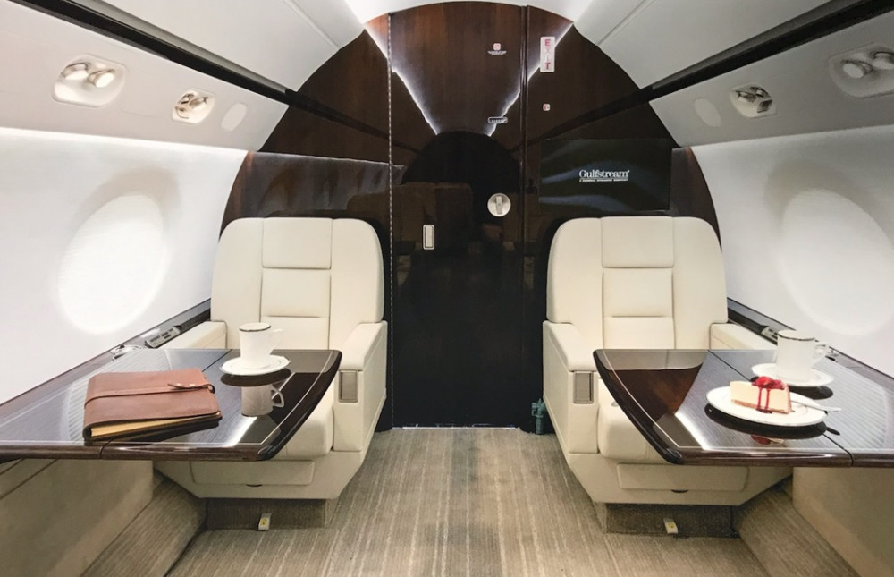The tastefully appointed cabin features seating for fourteen (14). Forward cabin features four (4) Dove leather executive club chairs with foldout tables. Center cabin features a two (2) executive club chairs with foldout table opposite a four (4) place berthable divan. Aft cabin features a four (4) place conference group with a conference table opposite a credenza. The aft passenger lavatory is appointed with wardrobe and vanity. Cabinetry is a luxurious Qrt Fig Dark Etimoe complimented by pearl Nickel colored plating. Sidewalls are leather and fabric and the headliner is an Ultra leather Ermine color.