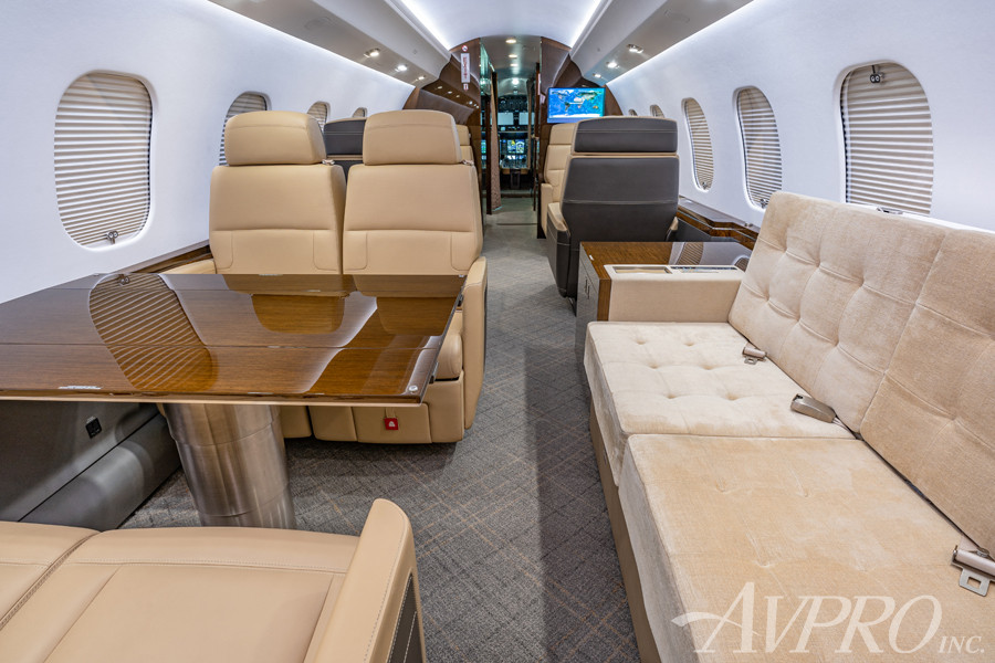 Mid Cabin: Four (4) place conference group with hi-lo table opposite a three (3) place divan (certified for 2 passengers take-off and landing due to emergency exit), electric pocket door for additional privacy