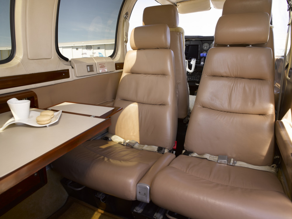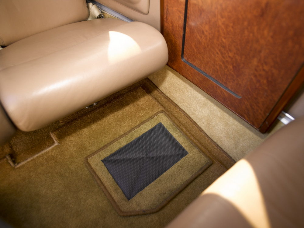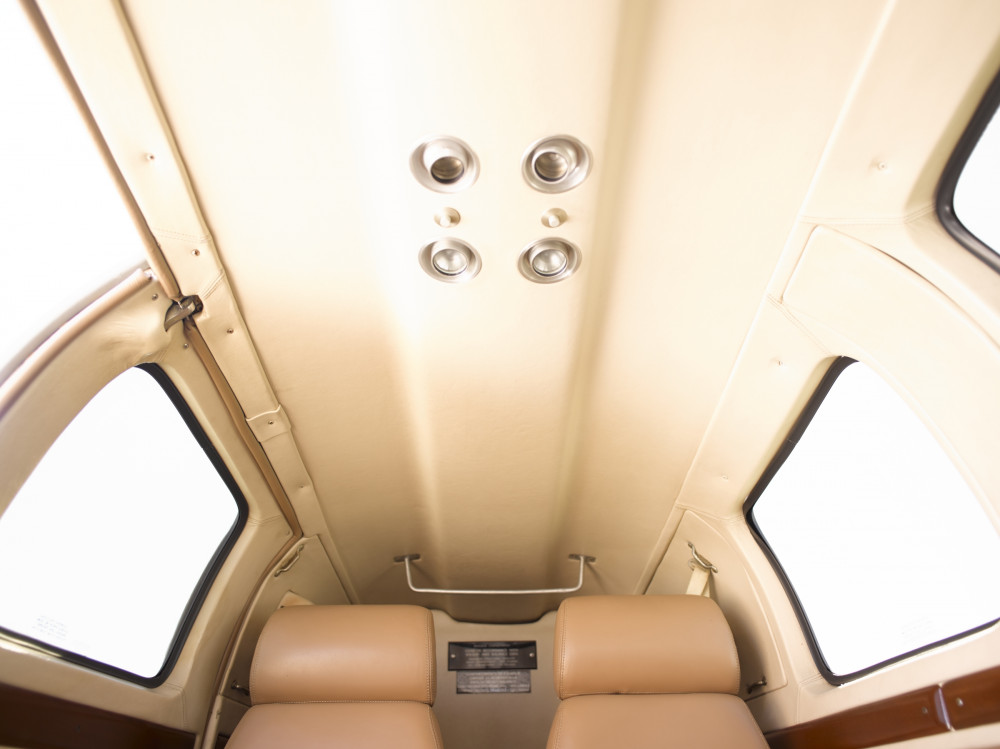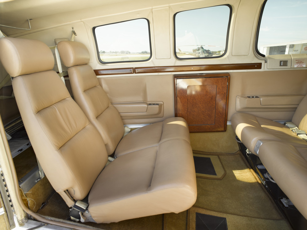 2013 Interior with beige leather seats and side panels, club seating, high gloss burl woodwork, sheepskin crew seats in good condition, G&D window inserts.