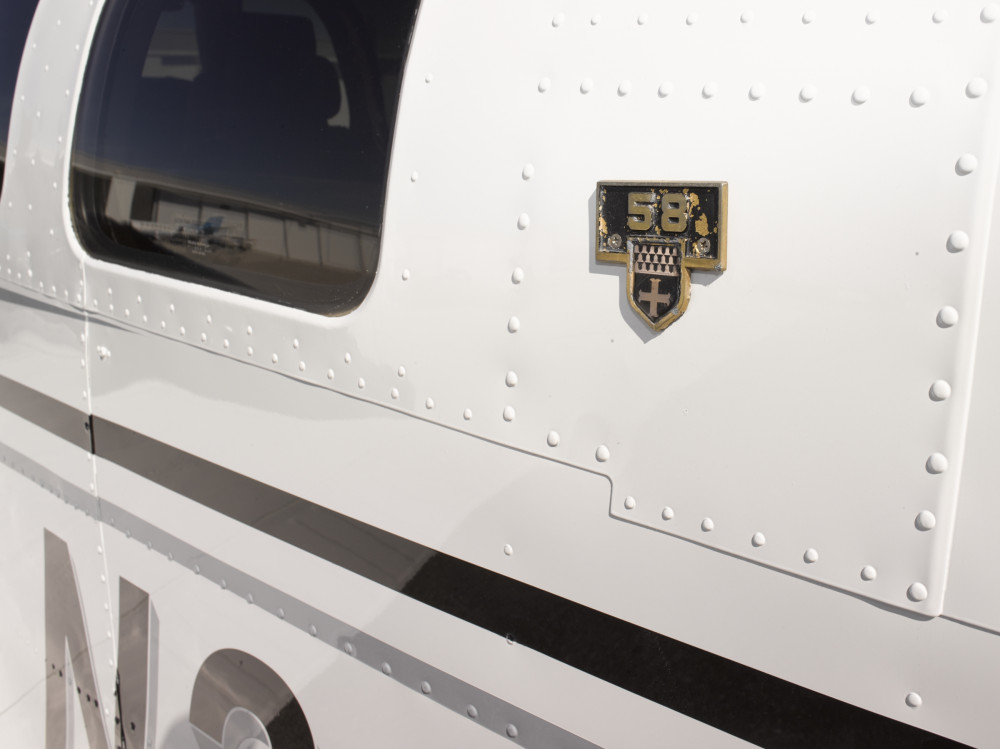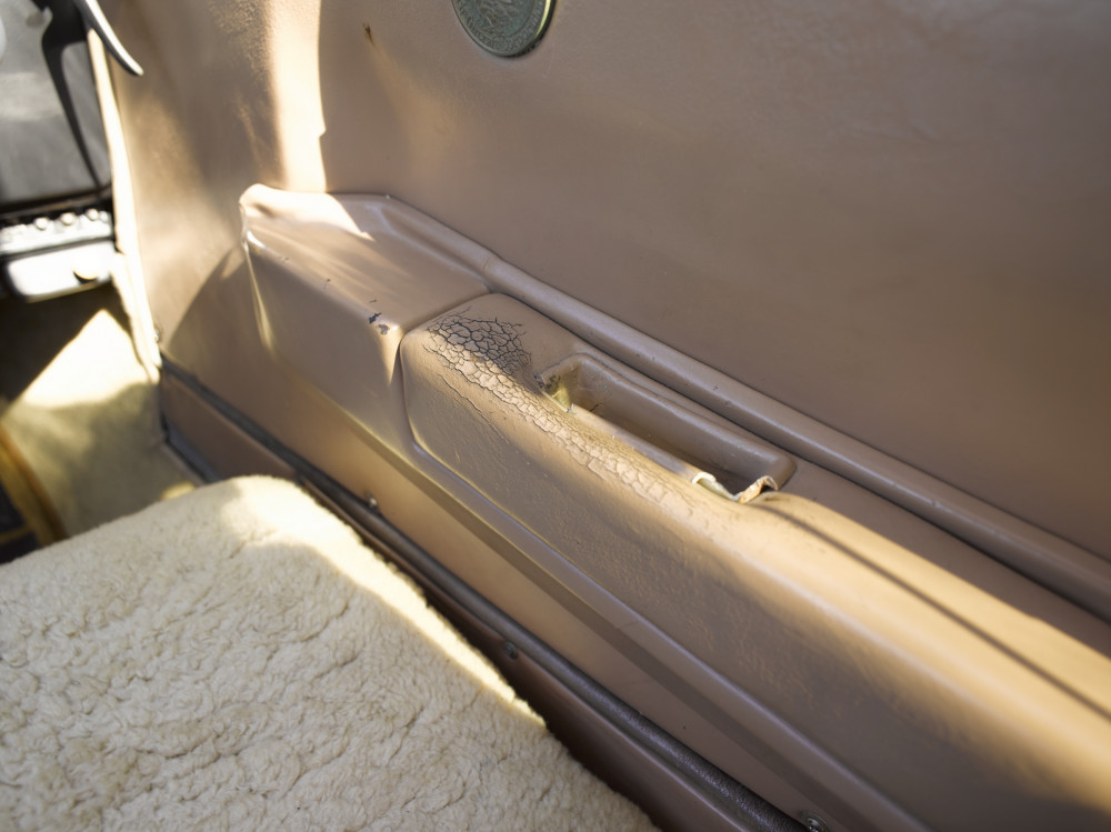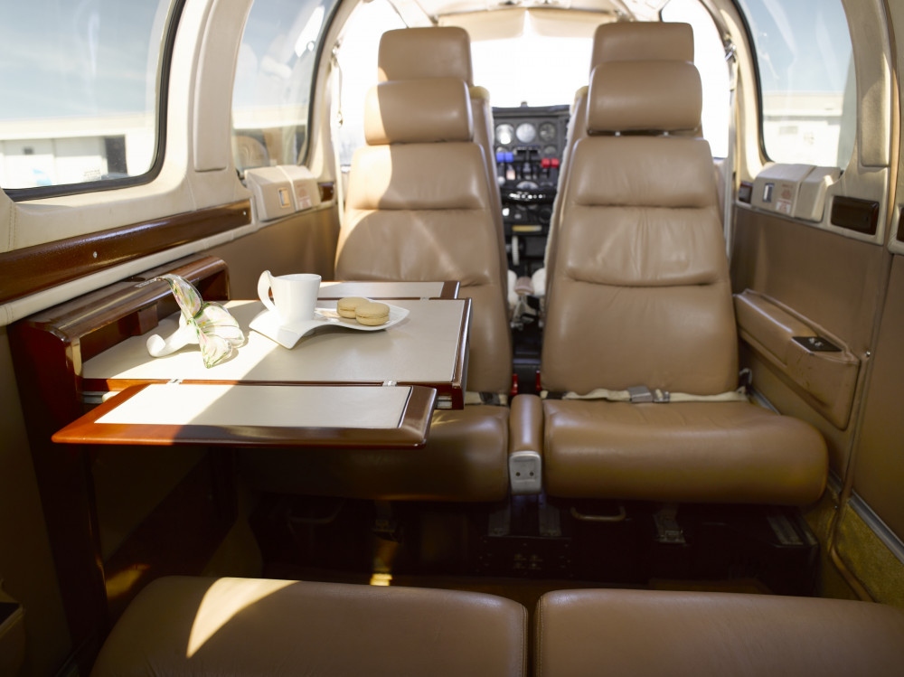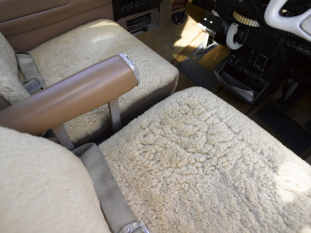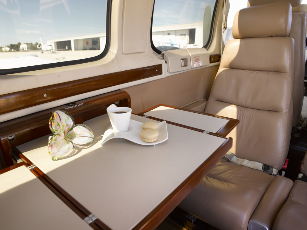2013 Interior with beige leather seats and side panels, club seating, high gloss burl woodwork, sheepskin crew seats in good condition, G&D window inserts.