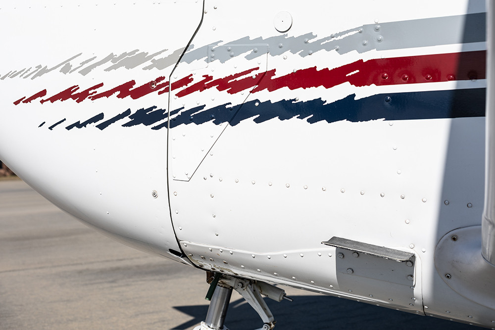 Matterhorn White Base with Gray, Burgundy, and Blue Accents. Underwing Courtesy Lights, Wing Tip Strobe Lights, and Landing/Taxi Lights.