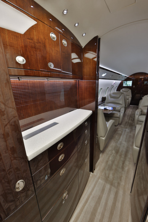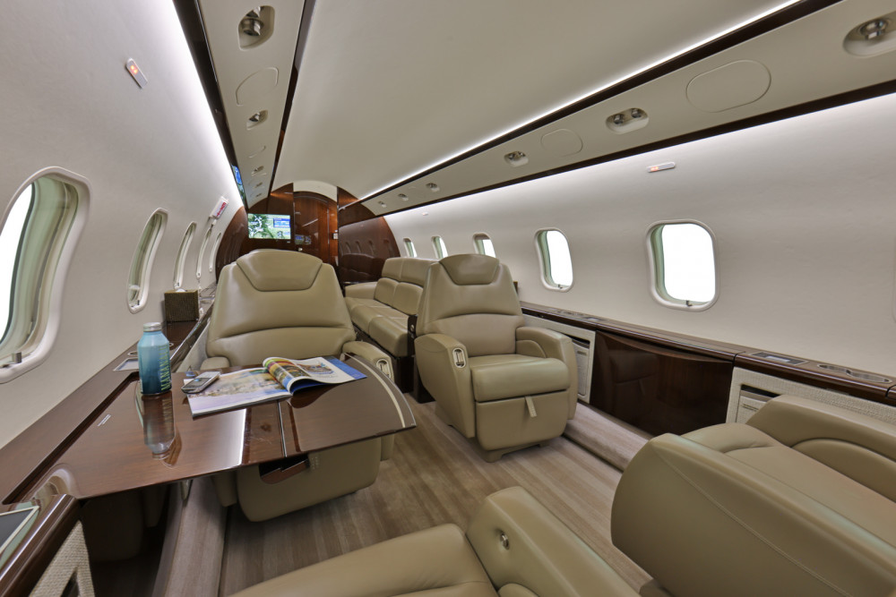 Custom Fireblocked Interior.10 passenger total, with 6 seats, 3-Place LH Divan and belted lavatory seat. The cabin features eight (6) executive club seats with executive foldout tables. Forward galley and aft lavatory.