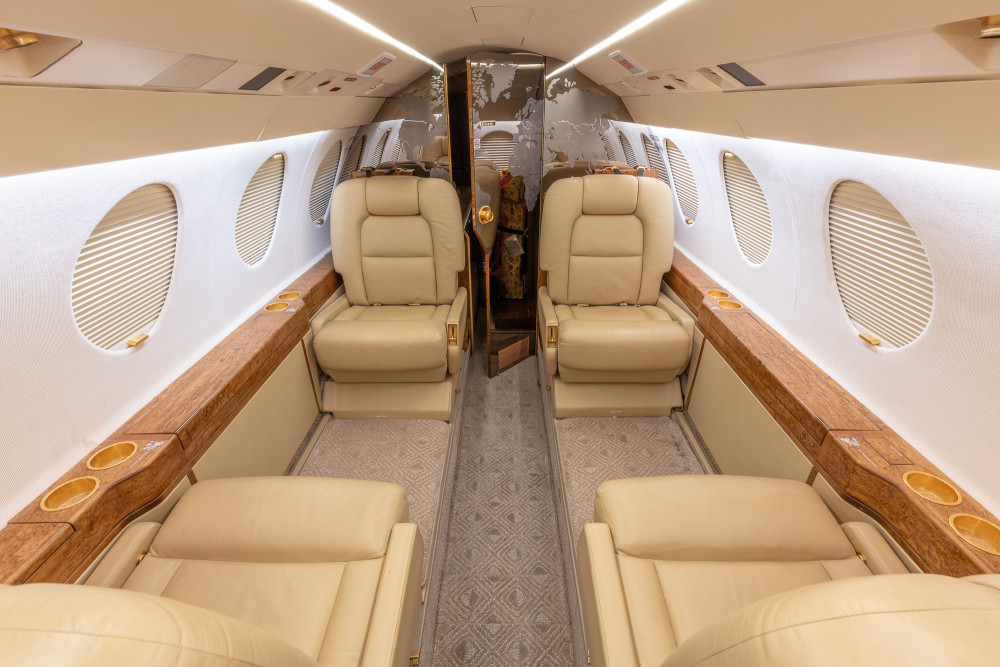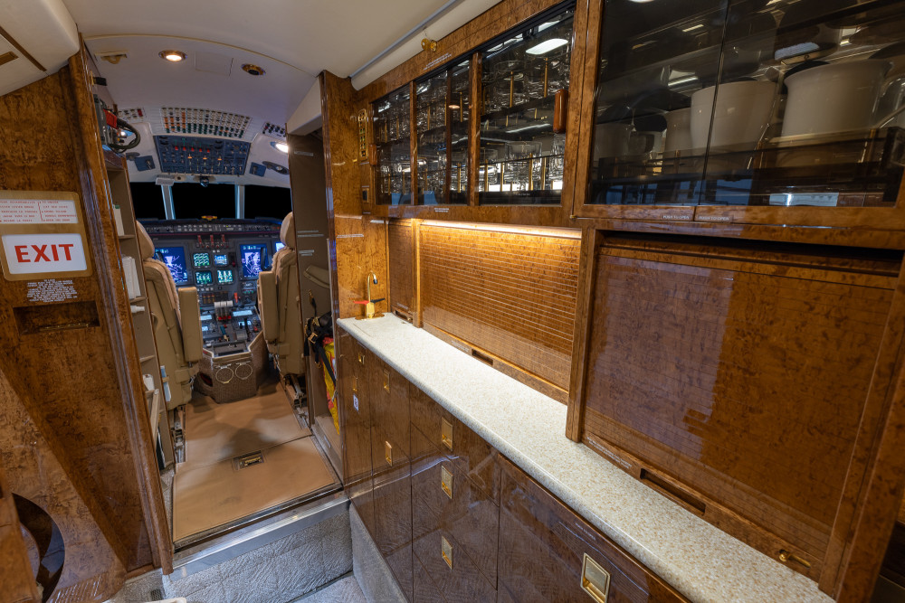 Original: Eight passenger executive interior in double-club arrangement. The seats are finished in tan leather and complemented with gold plating. Sandstone ultra-suede headliner, and beige side panels. The forward full-service galley features a work surface, crystal storage, ice drawer, condiment, and silverware storage. Aft enclosed lavatory with vanity.
