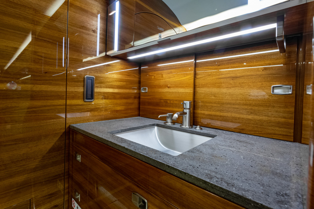 toilet and aft storage closet, as well as stone flooring in galley and lavatory, complete this well-equipped interior.