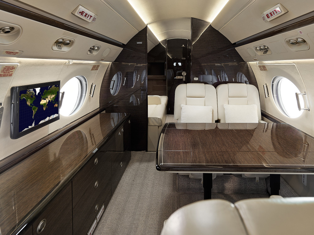 The wood/cabinetry is a glossy grey-colored straight woodgrain, and all cabin single seats are covered in light grey leather. The aft divans are covered in light grey Ultraleather. All plating throughout the aircraft is Satin Pewter. All of the carpet is light grey with darker gray stripes running from fore to aft. The window reveals, PSU’s, headliner and lower side panels are covered in light grey Ultraleather. The galley, forward and aft lavatory countertops are solid surface in off white color.
