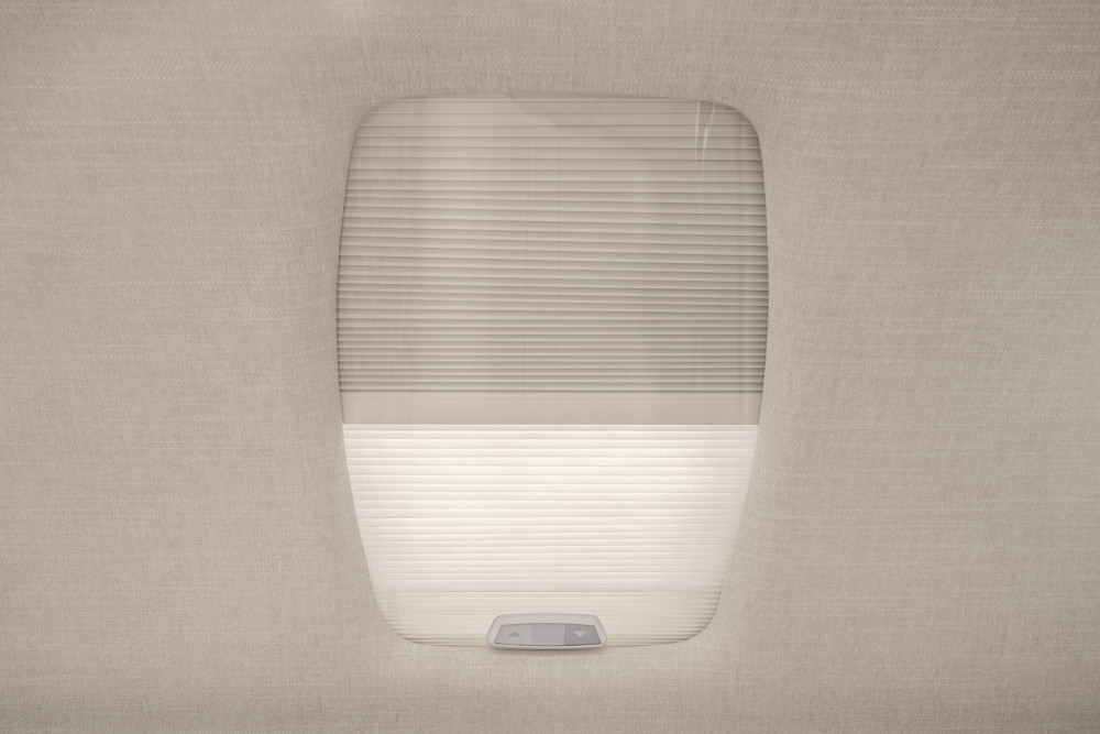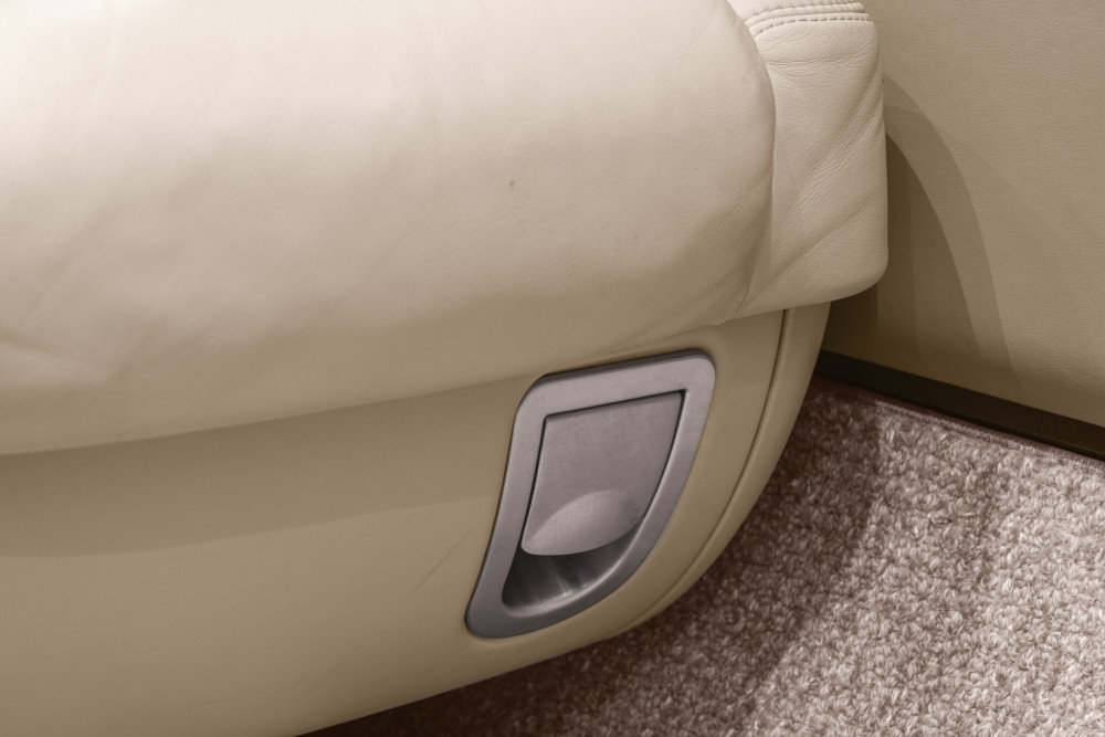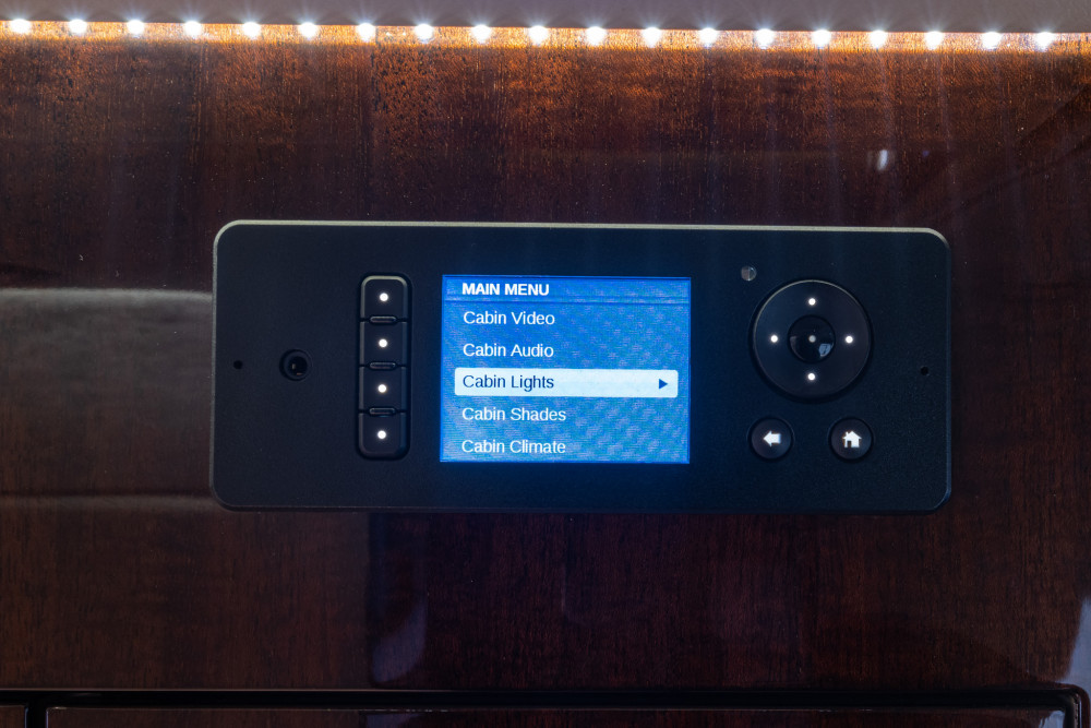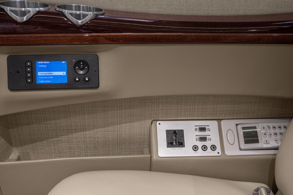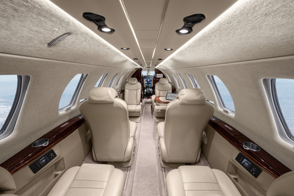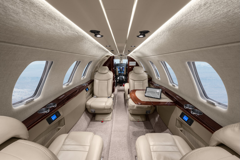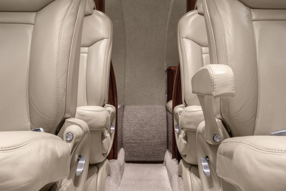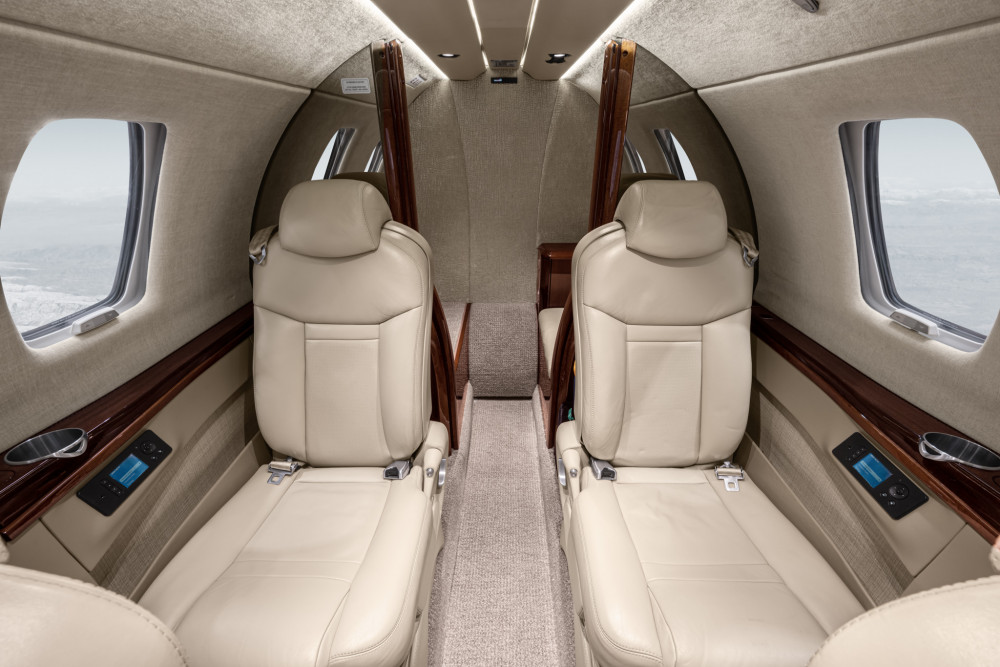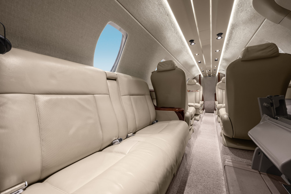 Nine (9) passenger executive configuration features a forward right-side 2-place side-facing couch, followed by a 4-place club with manually operated executive tables between the opposing club chairs, followed by two (2) forward-facing club chairs, followed by an Aft Belted Flushing Lavatory (externally serviceable) located behind a cabin divider with privacy sliding pocket doors. Light Beige Bisque (tan) colored seats.