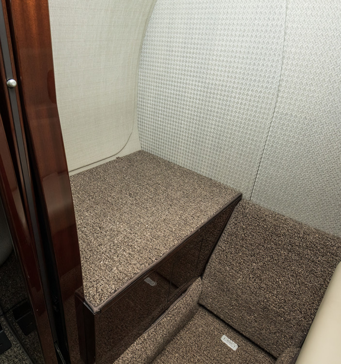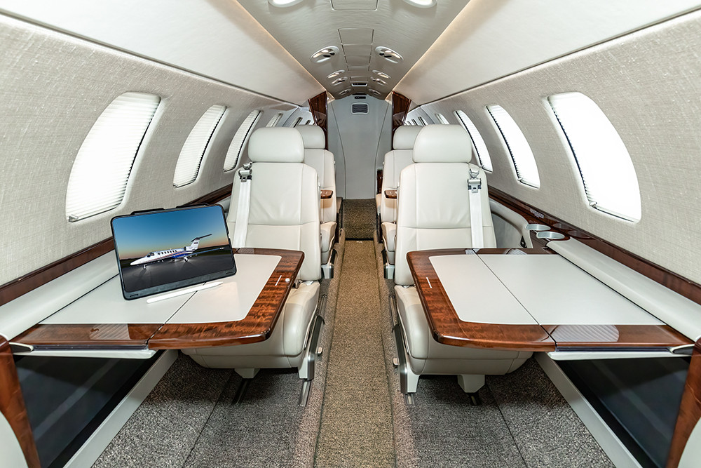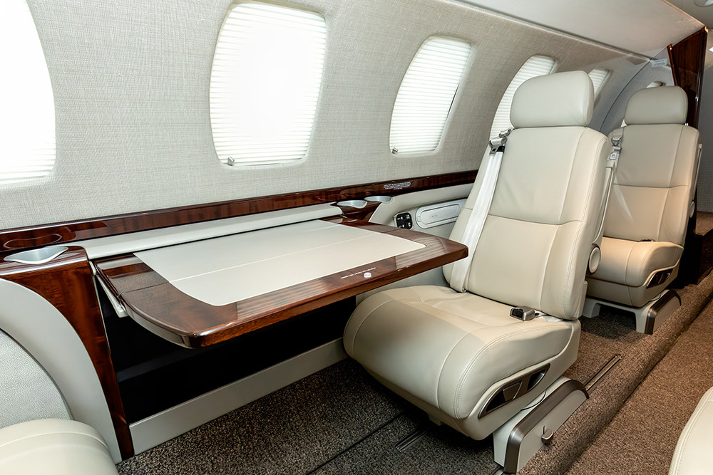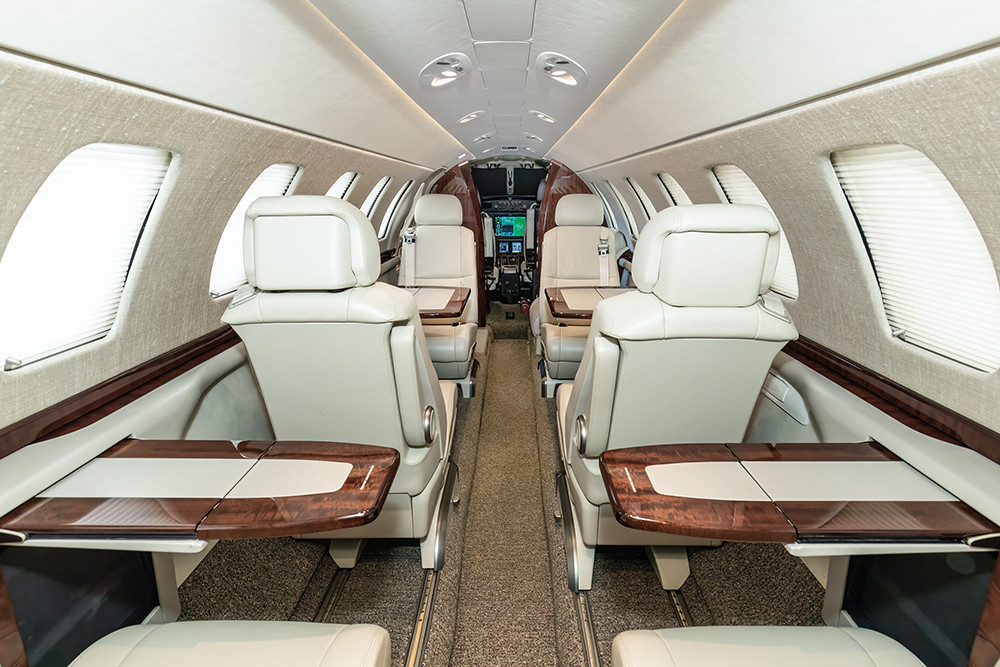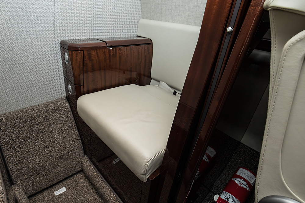 Eight Passenger Seating Capacity: Main Cabin Seating arranged in a Center Club Configuration with Two Executive Tables, Two Forward-Facing Captain Chairs with Two Slimline Tables, a Forward Side-Facing Seat, and an Enclosed Aft Belted Lavatory. Optional Large Galley (not installed). Silver Mirage Scheme.