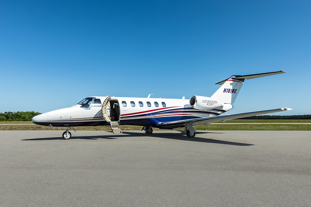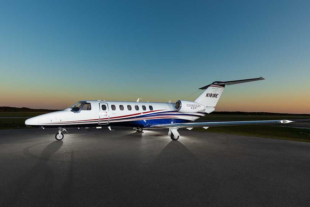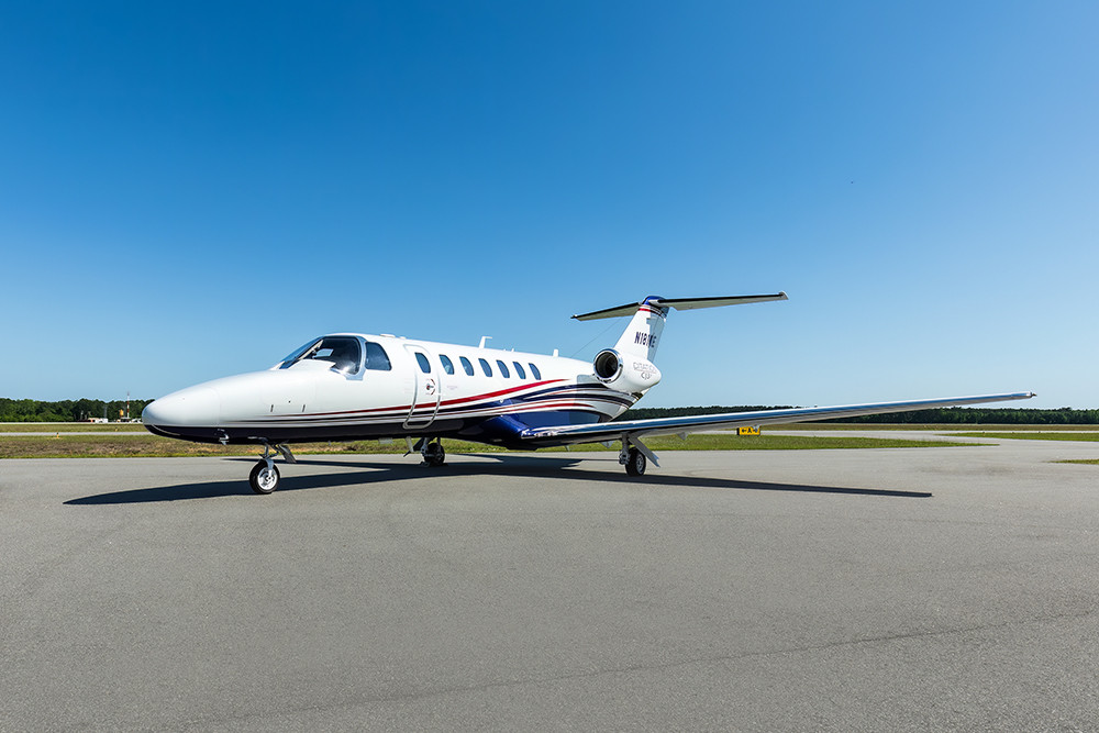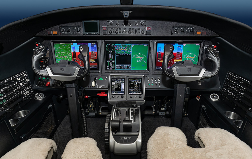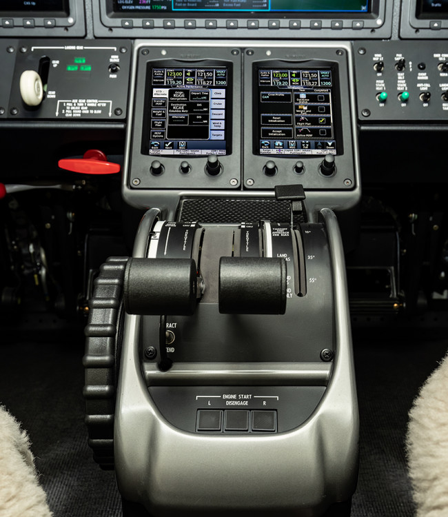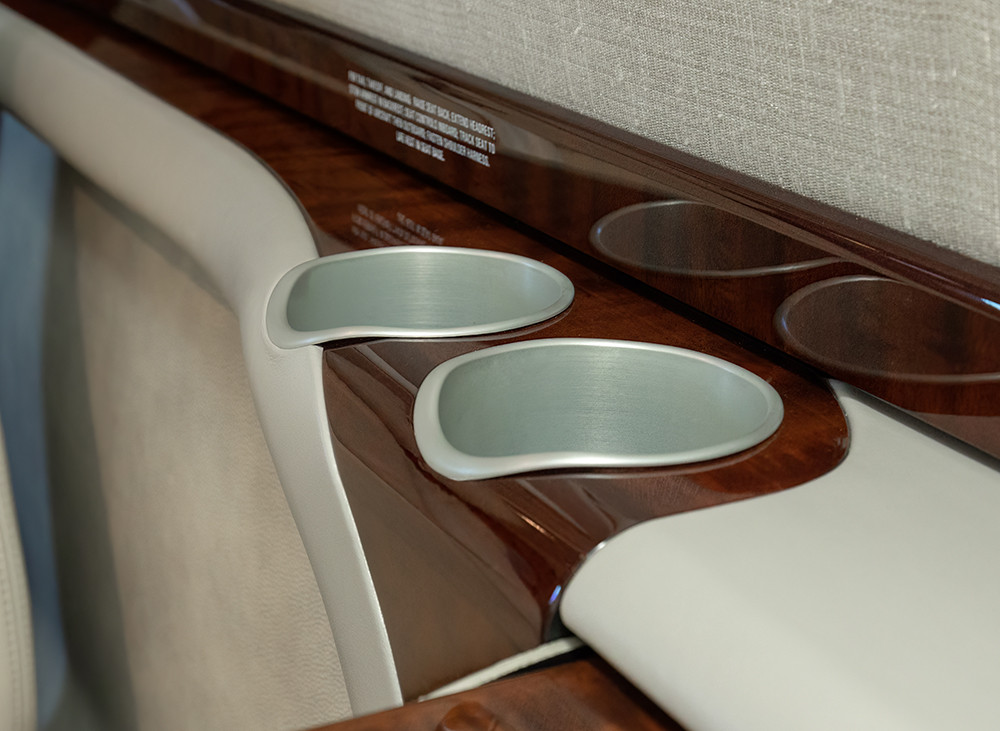 Eight Passenger Seating Capacity: Main Cabin Seating arranged in a Center Club Configuration with Two Executive Tables, Two Forward-Facing Captain Chairs with Two Slimline Tables, a Forward Side-Facing Seat, and an Enclosed Aft Belted Lavatory. Optional Large Galley (not installed). Silver Mirage Scheme.