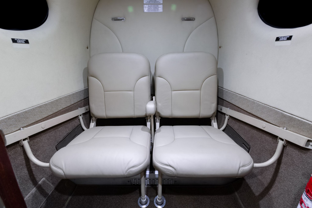 The beautiful 8 passenger configuration features a forward cabin 4-place club with a cabin monitor and 2 executive tables. The aft cabin follows with a 4-place club with 2 executive tables and has an aft belted lav. An additional 2 seats (not certified for TTL) can be placed in the aft baggage compartment.