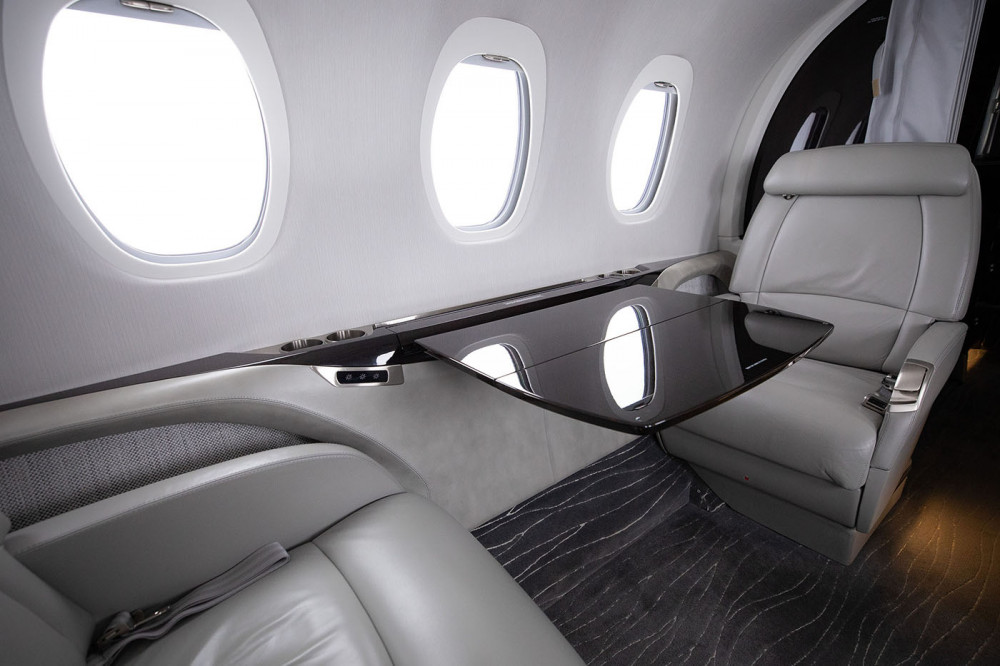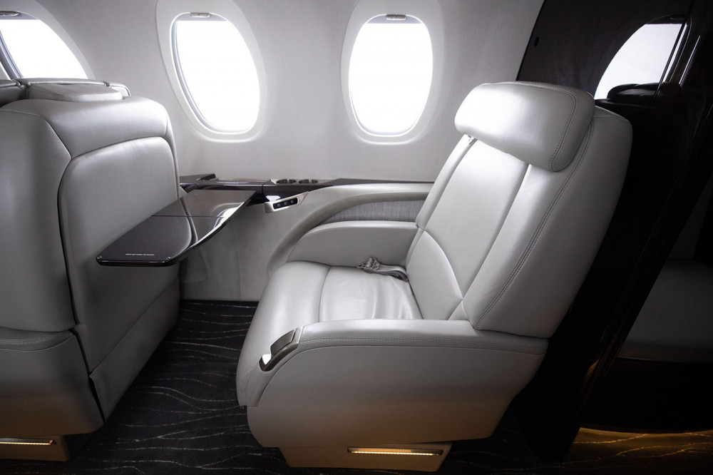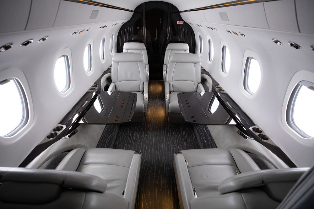 CABIN: Cabin seating for eight passengers with a center-club arrangement and a right-hand two-place side facing couch. There is a non-belted, flushing toilet and a belted Left-hand side facing seat in the lav.
