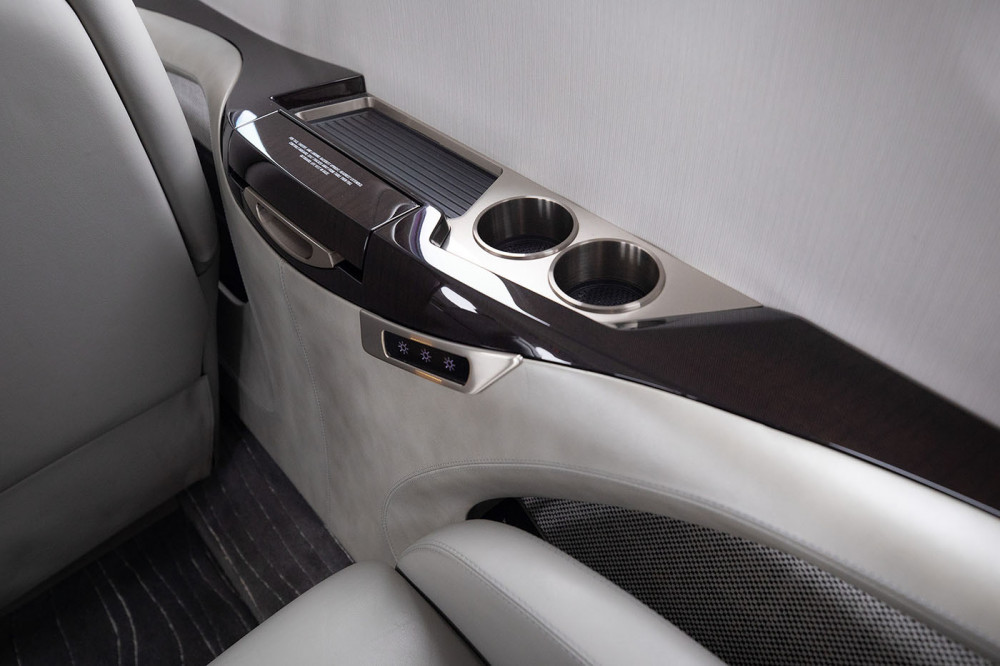 Interior is Greystone Leather with Quaker City Plating. Cabinetry is High Gloss wood Veneer French Walnut.