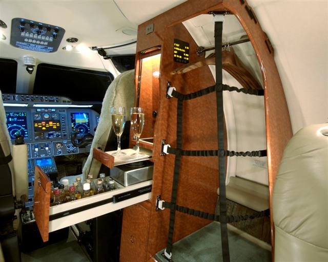 Executive Configuration: Light oyster stretch headliner, Custom dark green Jaguar Six Passenger Executive Seats with Fawn leather seats, smoked nickel plating, birch leather table, RH Refreshment center with Cognac Birdseye laminate cabinetry, Penny & Giles cabin display, Dual 110-volt AC personal computer outlets, Hang-up baggage and Aft lav