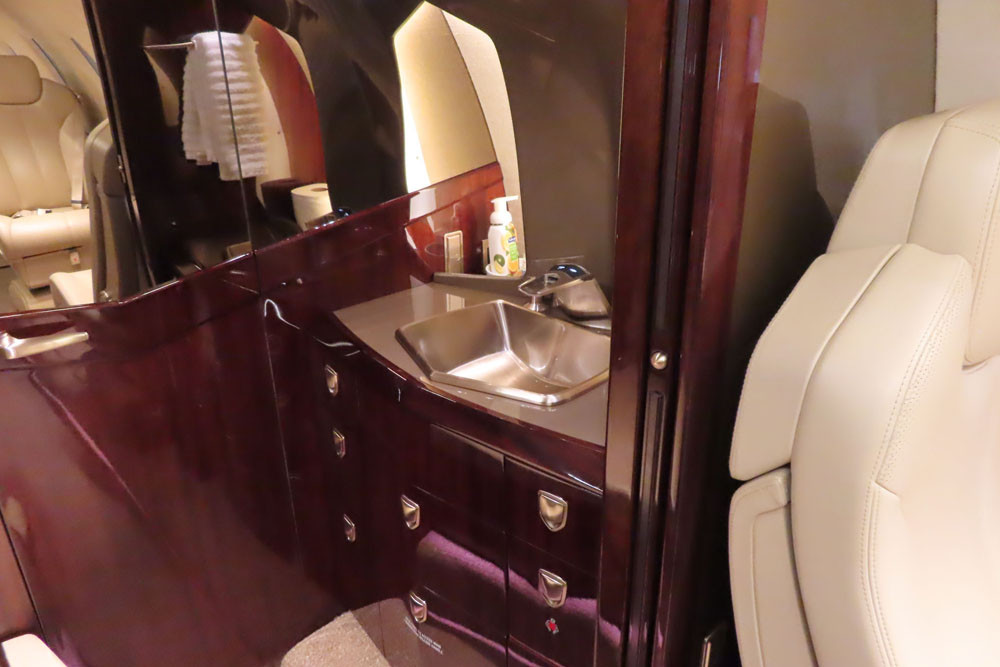 The lavatory features aft divider pocket doors and a right-hand belted externally serviceable toilet opposite a mirrored vanity with sink and faucet with temperature-controlled water.
