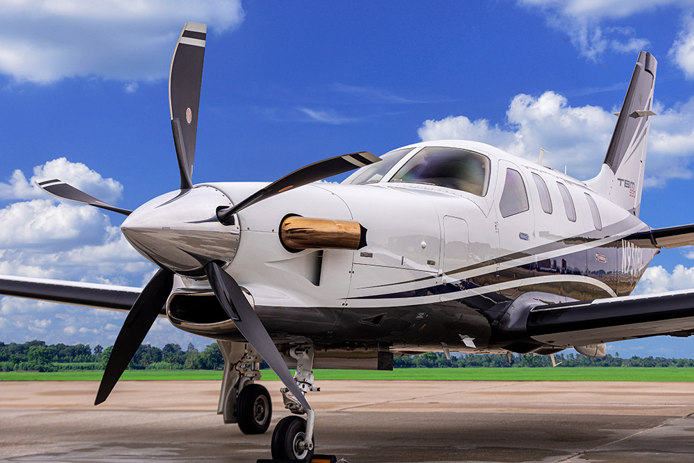 Elite configurable Interior. Socata TBM Black Diamond Edition with Black Onyx leather seats, Flat Black Metal vents and lights with Carbon Fiber table and upper accent package. Six genuine leather seats with adjustable backrests and folding arm rests. Leather upper cabin side panels in Polynesian Pearl, leather covered lower cabin side panels in River Stone.