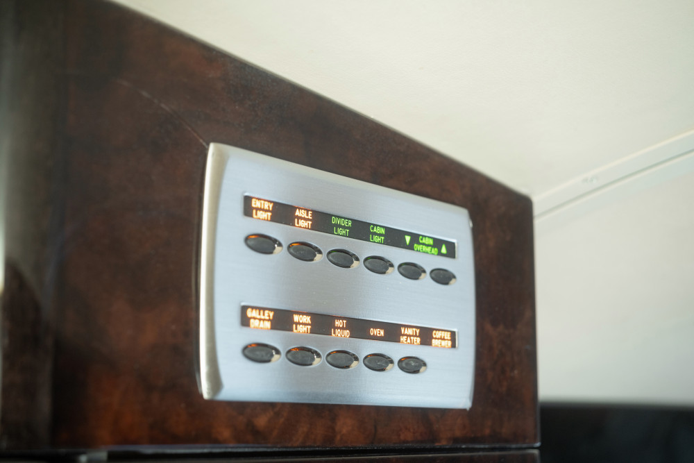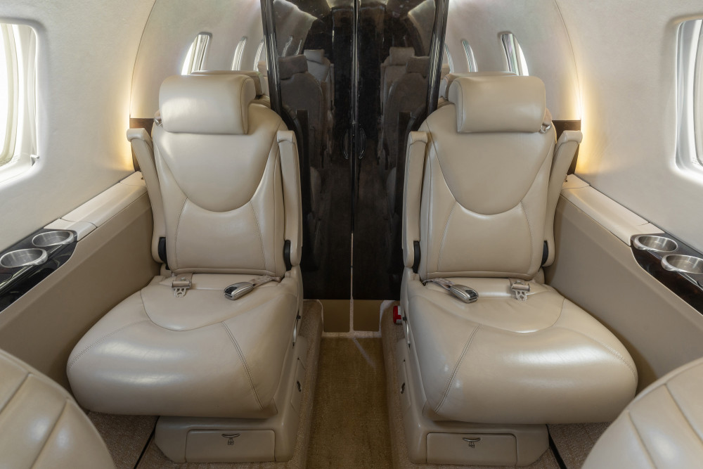 Nine passenger interior including belted lav seat. The forward cabin includes a two person side facing belted seat opposite the entry door. The main cabin continues with four, single club seats followed by two forward facing single club seats. The aft cabin has a private lav area with a potty seat and small sink. The carpeting is a light beige with mono-tone pattern. All seats are upholstered in a light tan leather. There is dark brown two-tone woodwork throughout the cabin and silver nickel plating. There are fold away tables at each seat for added convenience while eating or working. The forward cabin includes a refreshment center complete with coffeemaker and additional storage.