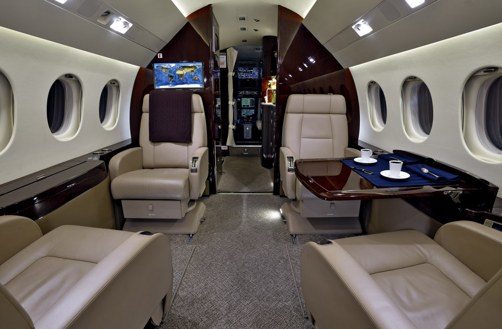 10 Passenger Executive Interior consisting of four forward club chairs and an aft 4-place conference group/dining table with 2 club chairs opposite. All seats completed in Mesa Tan leather, the headliner is Ivory Ultra-Suede, the carpet is Velluto Pello Beige and all plating finished in Aged Brushed Nickle. 46” Galley includes a coffeemaker, microwave and high temp oven. Entertainment system includes CD Player, DVD Player and Airshow. There are two Rockwell Collins plug-in 10.6 color HD LED backlit monitors with swing arm. Third flight deck seat with floor storage. LH crew closet with flight-deck curtain. Galley Annex is interchangeable between 7 Bus Bins or 3 Atlas Tray carriers cooled by cold air outlets. Aft lavatory includes a center mirror that hinges upward for easy viewing, pull up storage compartments on each side with lighting.