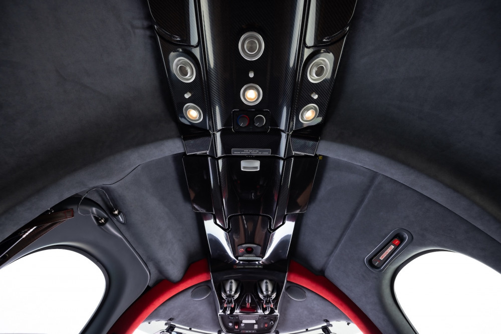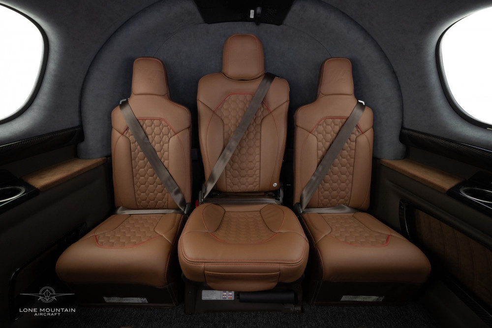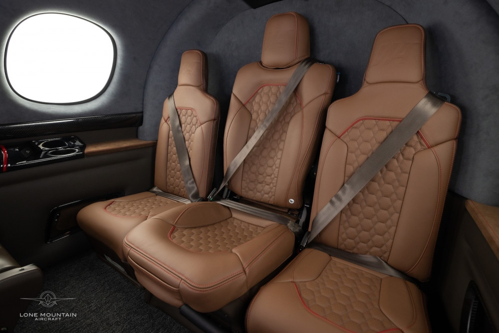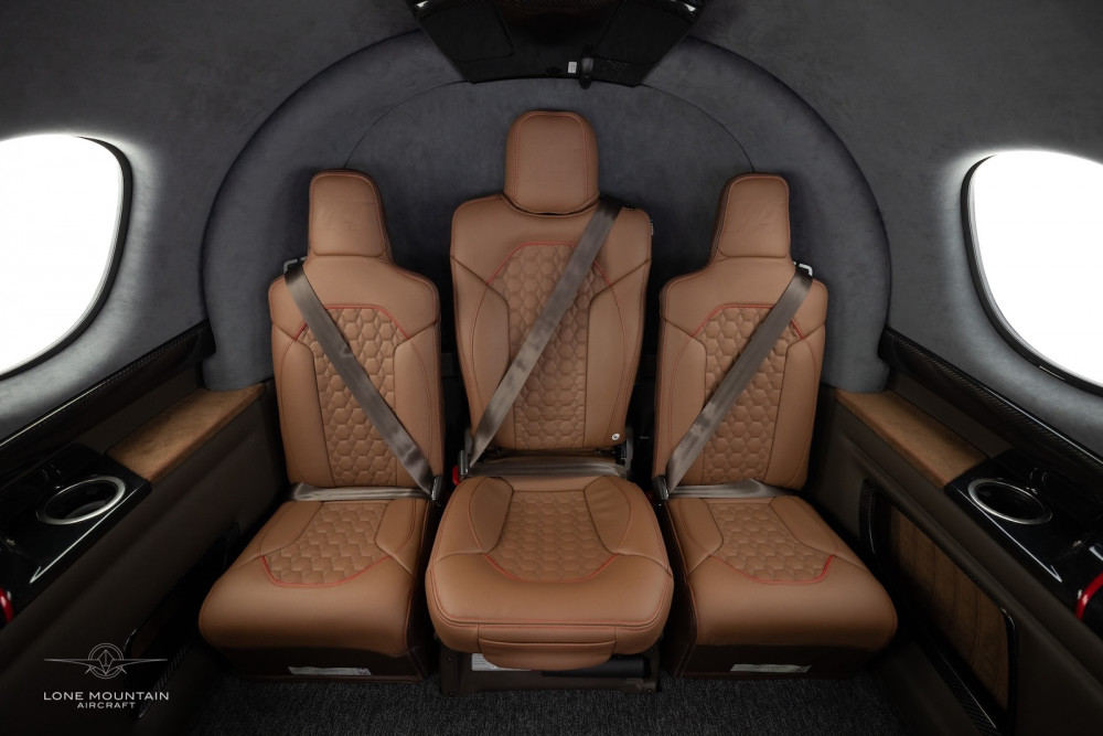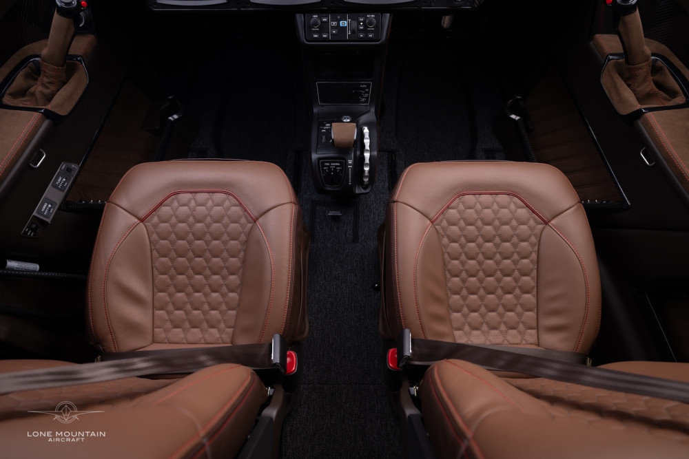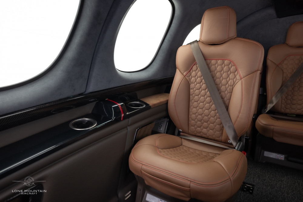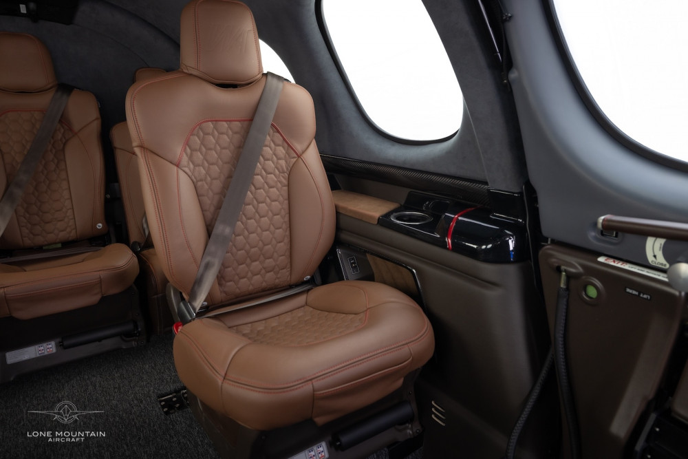 Interior with executive seating and center console included. Brown premium leather seats with red accents. Cross country seats included.