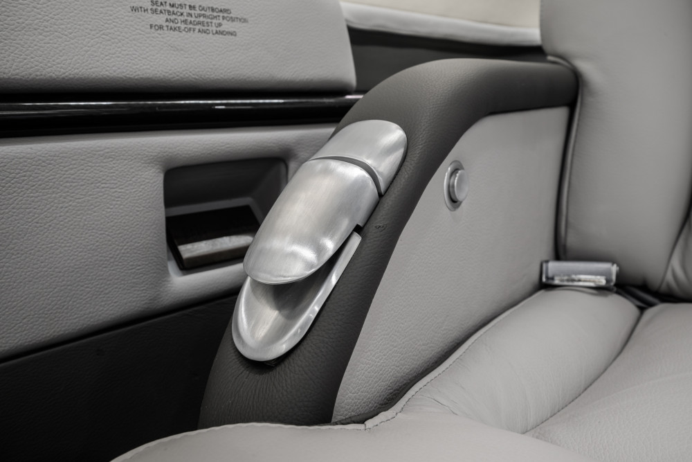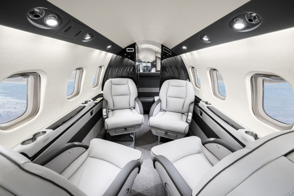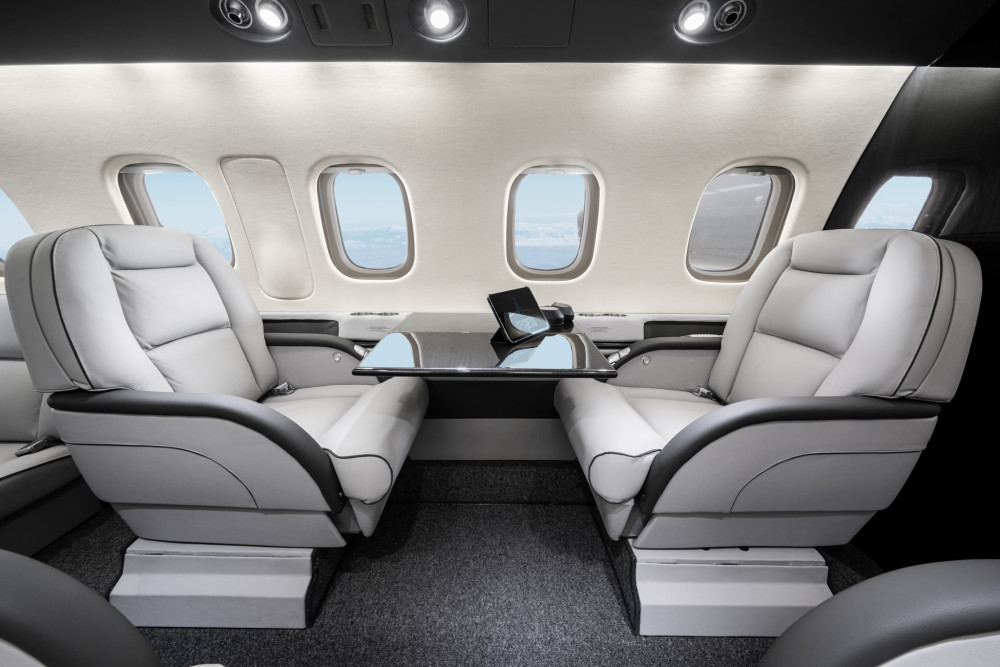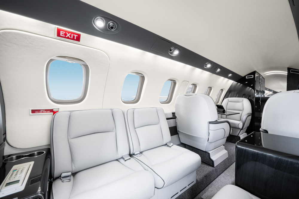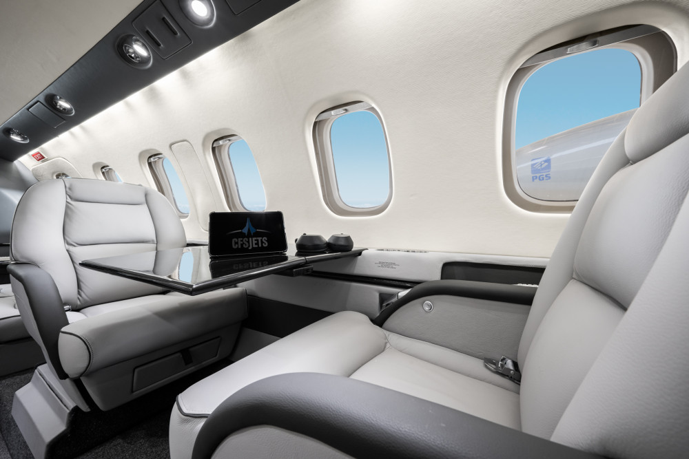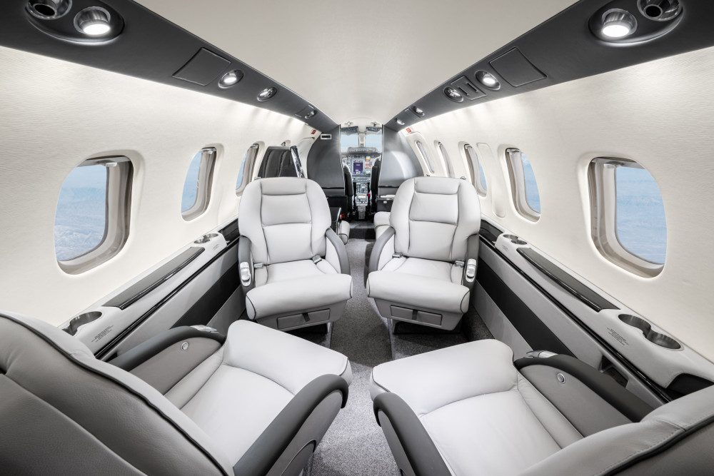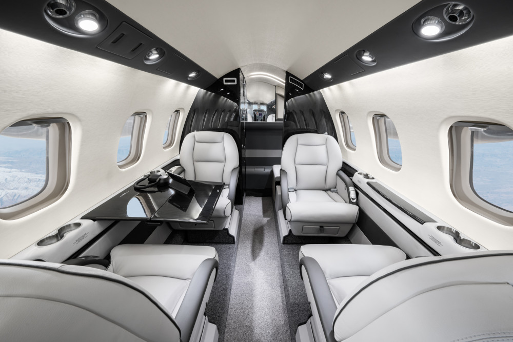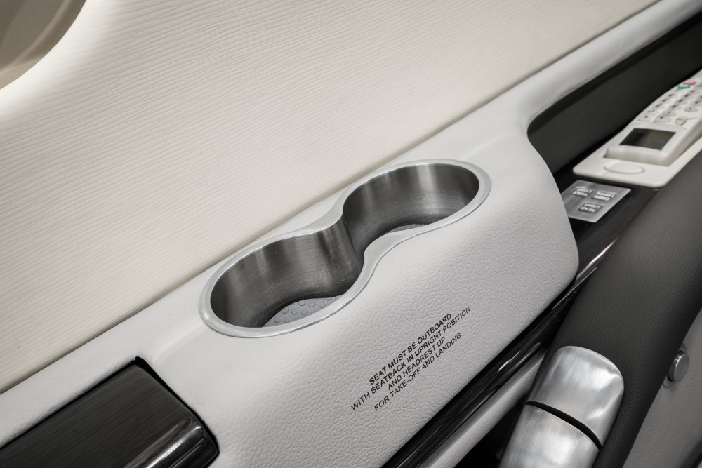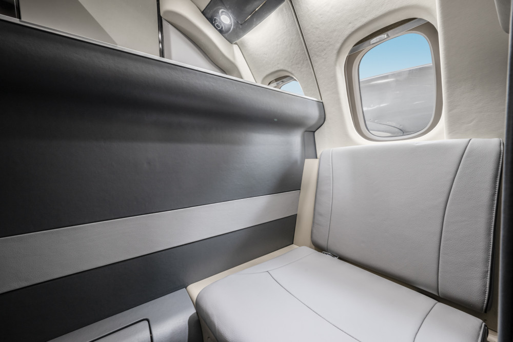 Completed in light gray leather. Forward single side-facing seat and refreshment opposite two place divan, with aft cabin in a four place club seating followed by fully enclosed belted lavatory seat.