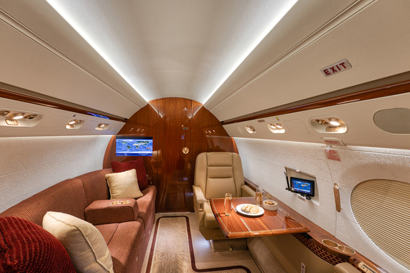 Entertainment systems consist of Airshow 4000, forward and aft 24" LCD monitors, ten (10) 7" sidewall monitors at each single seat location. Dual slot Blu-Ray player, Roku System and MFC printer. The custom forward deep galley includes a microwave, convection oven, ice chest, cold food storage, coffee maker and additional storage.