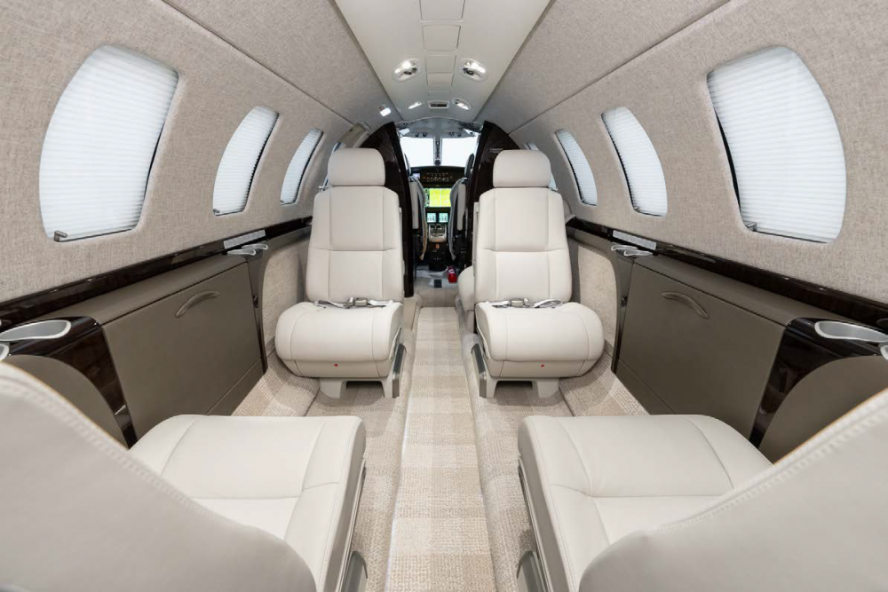 A sophisticated seven (7) passenger + belted lav configuration featuring a refreshment center with a side facing seat, a four-place club following two forward facing seats in the aft cabin. All with swivel capabilities and foldout executive tables.