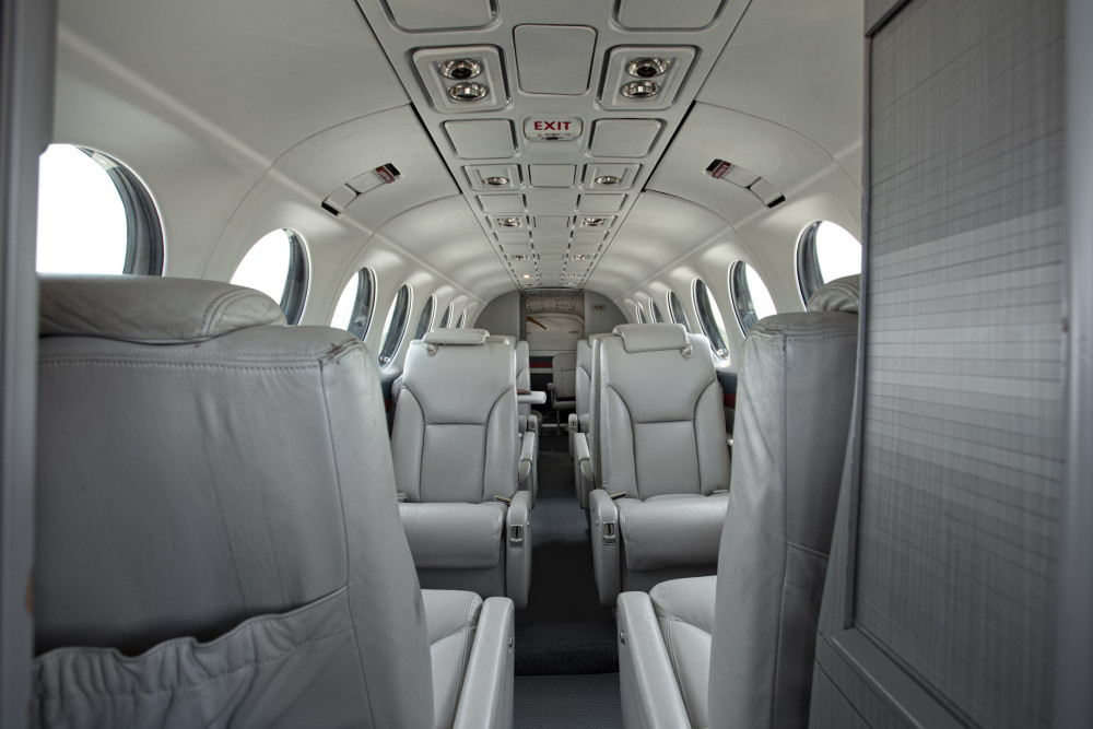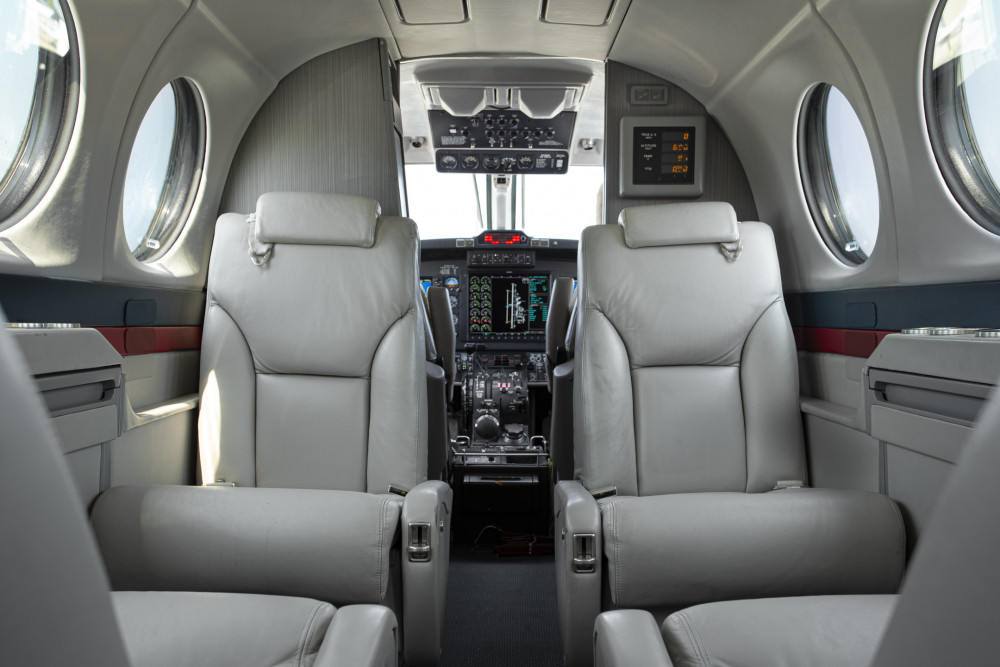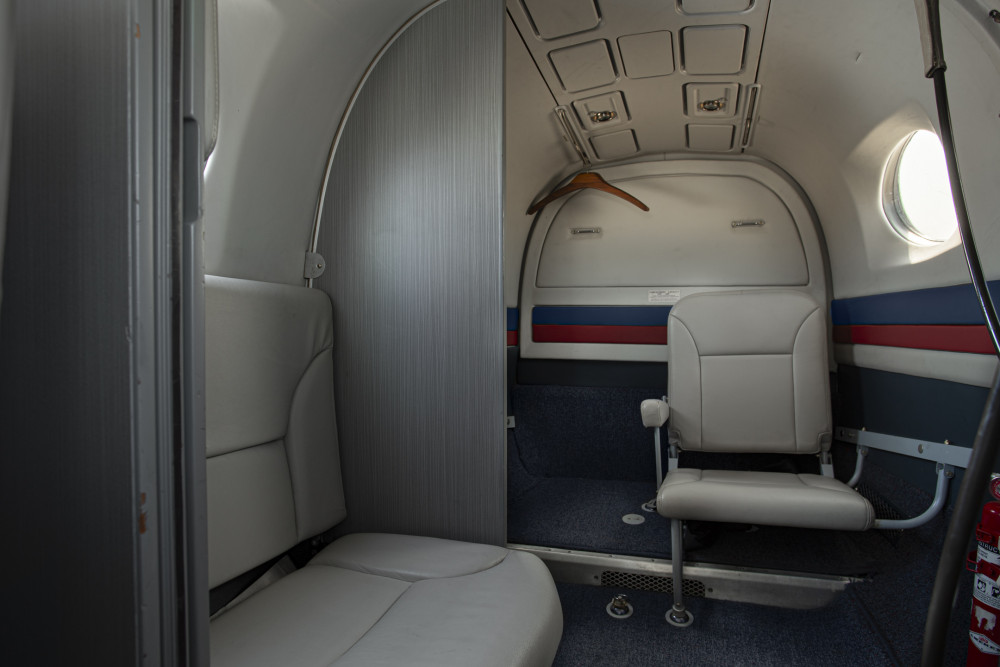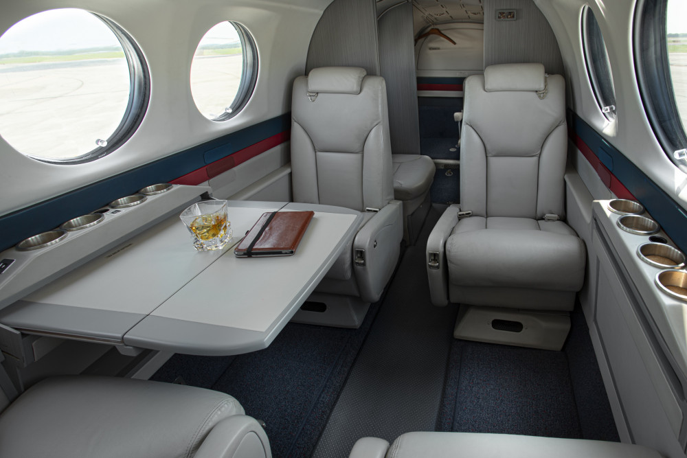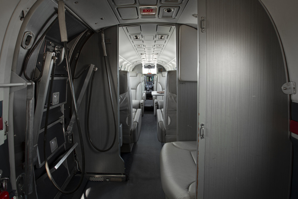 New August 2017 by Stevens Aerospace - Standard executive configuration with light gray seating and blue carpeting. AvFabs Dual Aft Jump Seats.