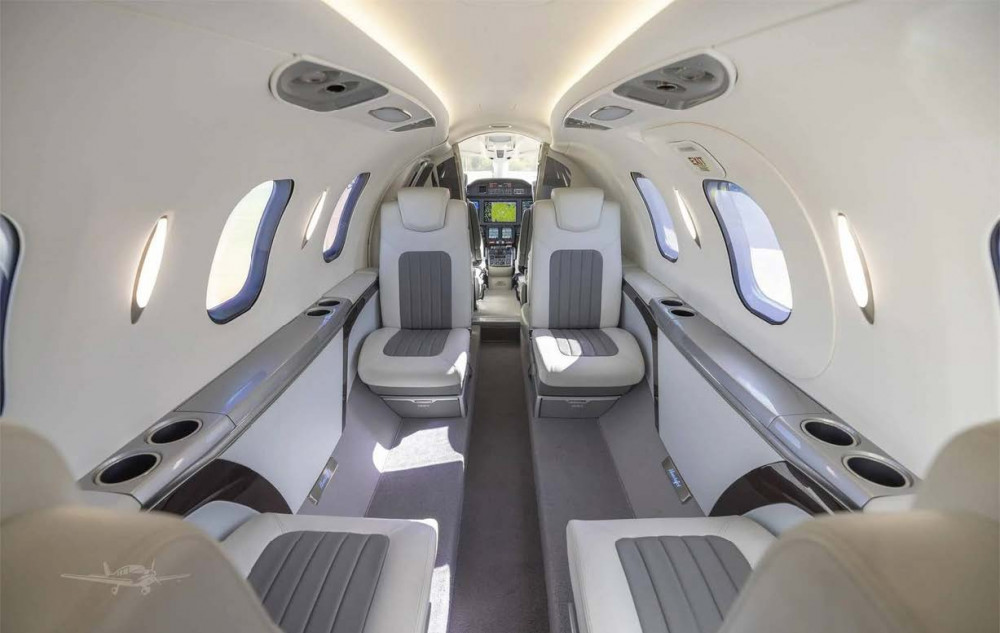 Two-toned leather seating, forward side-facing seat, mid-cabin 4-place