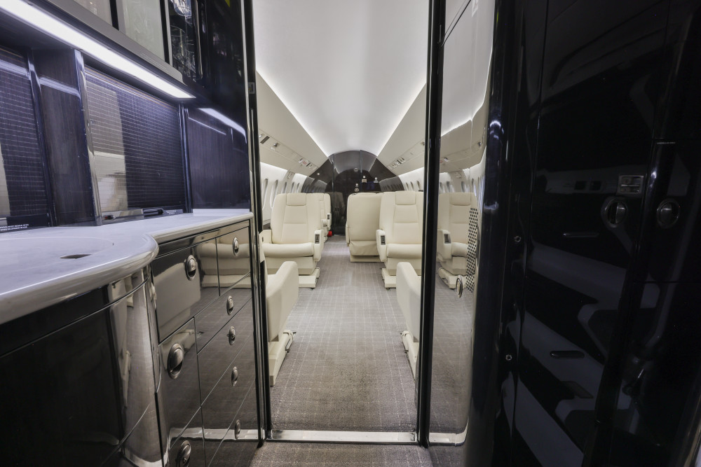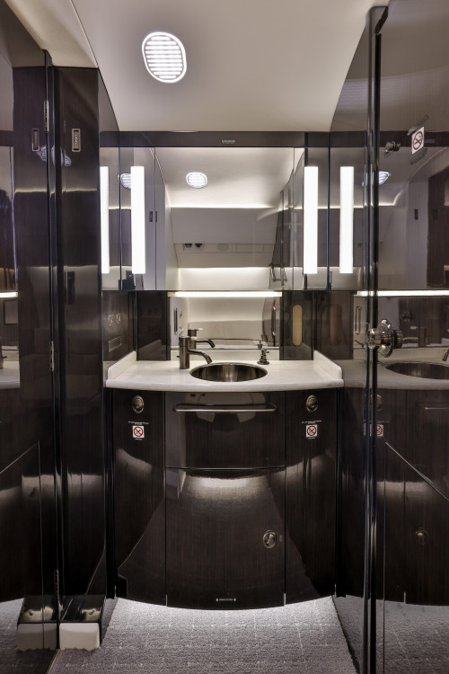 outfitted with an aft lavatory. The woodwork finish is black ebony veneer with a grey carpet. Forward bulkhead