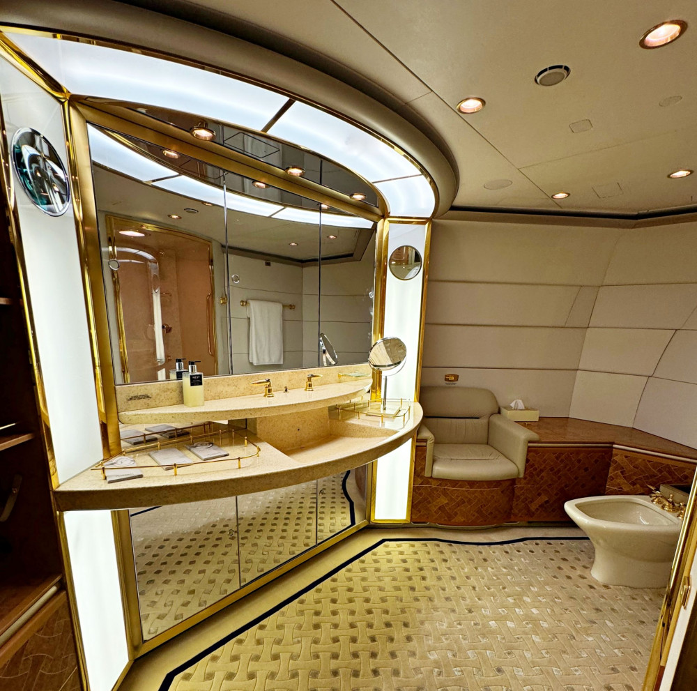 Cabin Configuration: Fwd Crew Rest Area, Twelve (12) PAX Fwd Staff Area; Twelve (12) PAX Lounge Area; Nine (9) PAX Dining Opposite a Credenza, Ten (10) PAX Mid Cabin Staff Rest Area; Seven (7) PAX Sitting Room; Aft Master Bedroom; Master Washroom with Lavatory, Shower, and Storage Cabinets