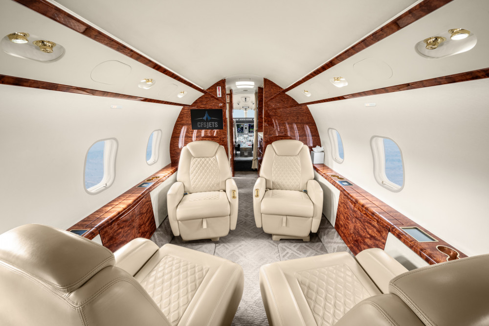 Four place club setting, followed by two club seats opposite three place divan, and aft belted lavatory.