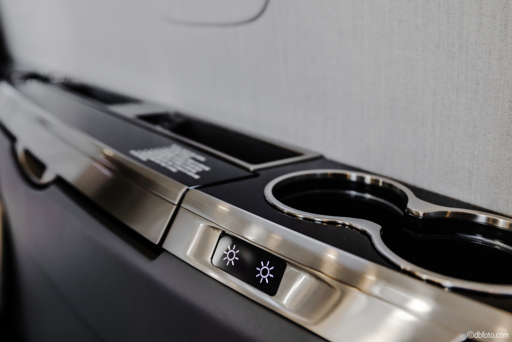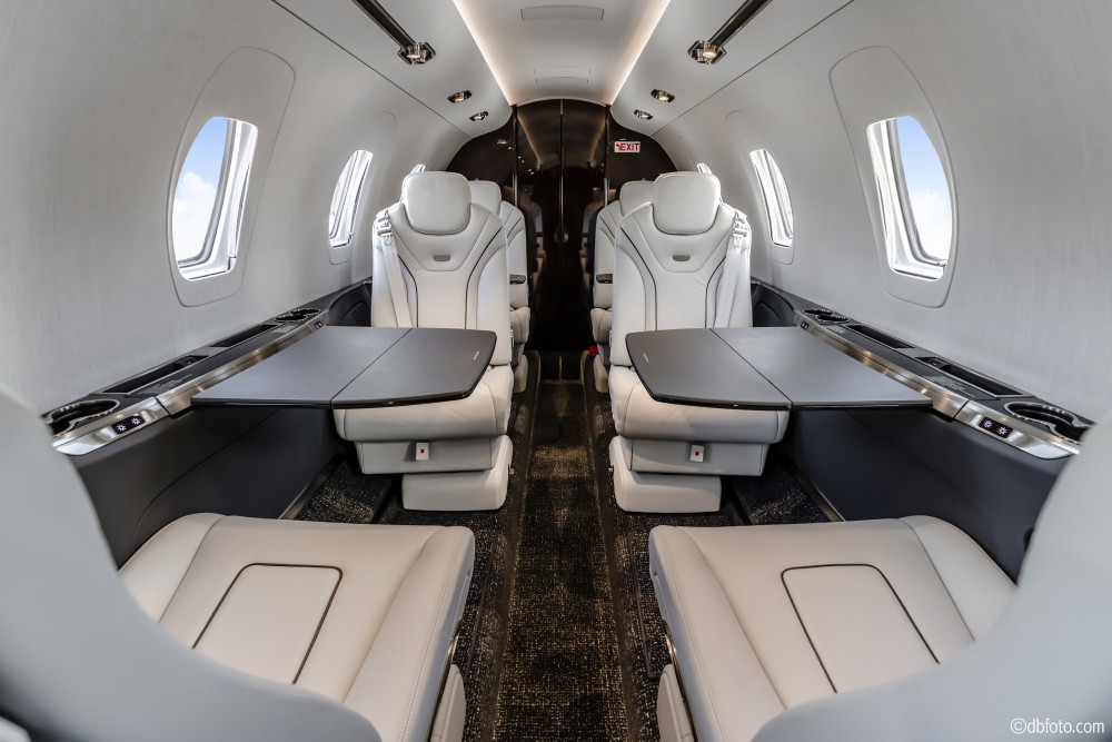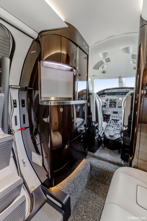 Glacier Interior Collection with 9 passenger seats include a forward club, two forward facing aft seats and a two-place divan across from the main entry door that is equipped with a fold-down back for storage. The 9th seat is a belted seat across from the lavatory. There is a refreshment center on the left side of the forward cabin that includes a hot tank, ice chest, storage areas, trash container and provisions for a microwave oven. There is also an acoustic curtain that stows against the forward divider to be used in front of the main entry door. The cabin also includes lighted cup holders, USB-A charging ports, wireless cellphone charging tray and 2 115V outlets. In the aft cabin, there is a externally-serviceable flushing lavatory with sliding privacy doors and vanity with temperature-controlled water. The airplane is also equipped with AVANCE L3 Wifi.