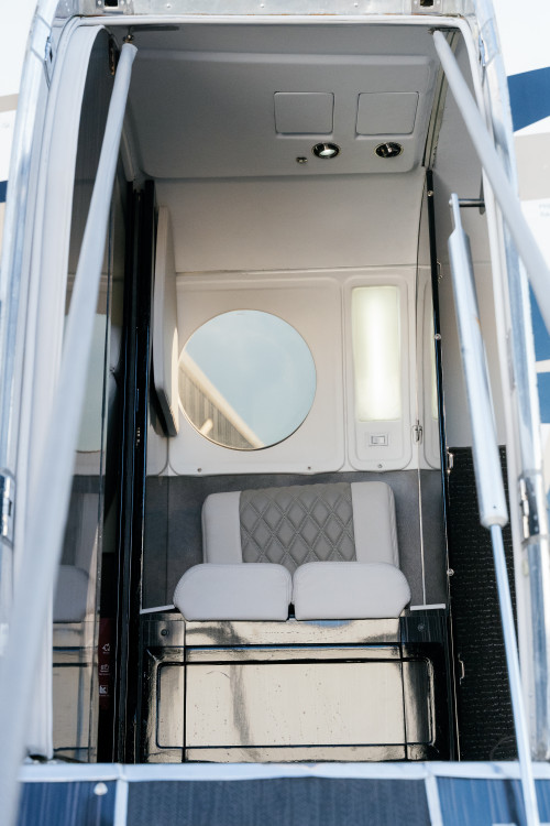 Solid aft cabin door, universal power outlets, drink holders, lighted logo cabin floor trim,