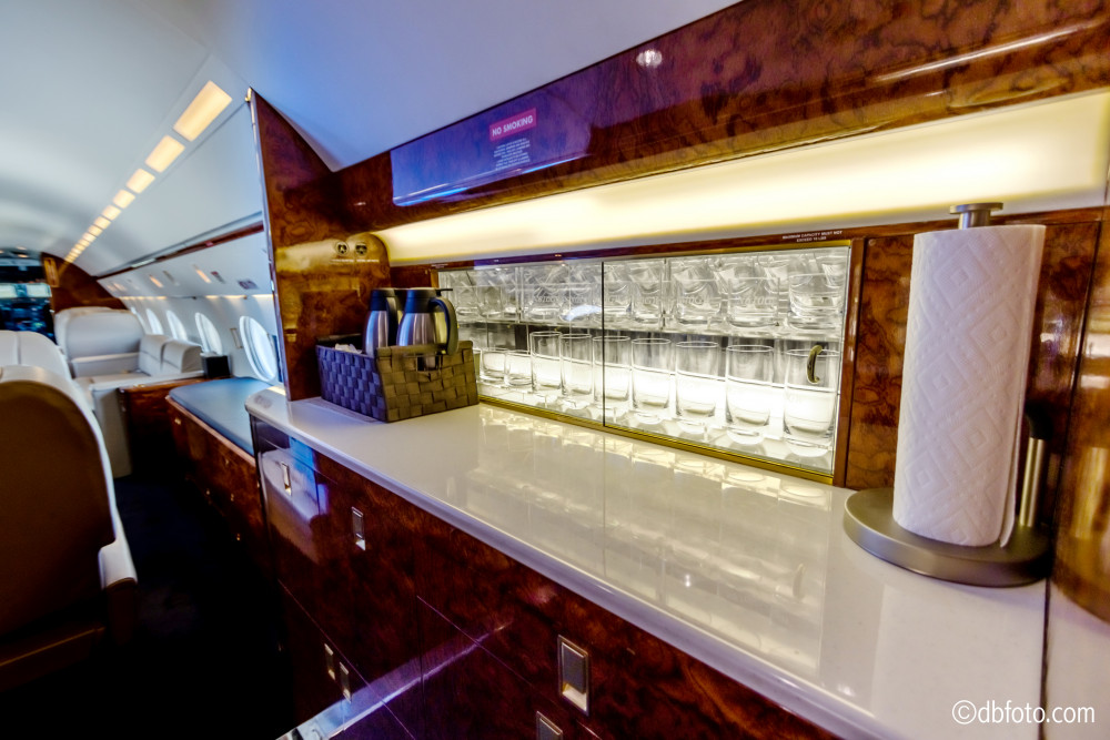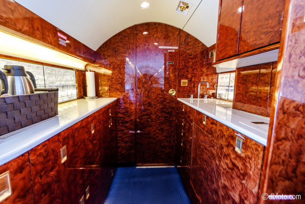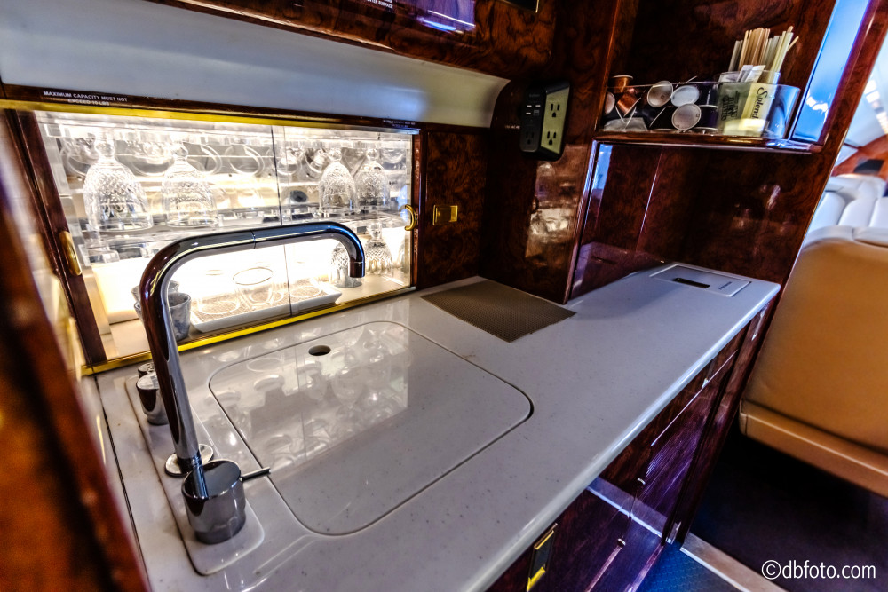 Beautiful 14 passenger + FWD and AFT jump seat interior refurbished to include the following, new carpet, lower sidewalls, window panels, valance, seat belts, headliner. New flooring in lavatory, galley, entry and air stairs. New counter tops in galley and lavatory. Credenza recovered with new leather pad. All cabin seats serviced and leather re-dyed. USB and standard outlet installed at owner’s VIP chair. Crew seating was replaced with new coverings. New airstair curtain installed at the main entry door. Installation of a cappuccino machine, new cutting boards, new plate cutouts and lexan stemware holders. Galley is equipped with a Hi-Temp Oven and Microwave.