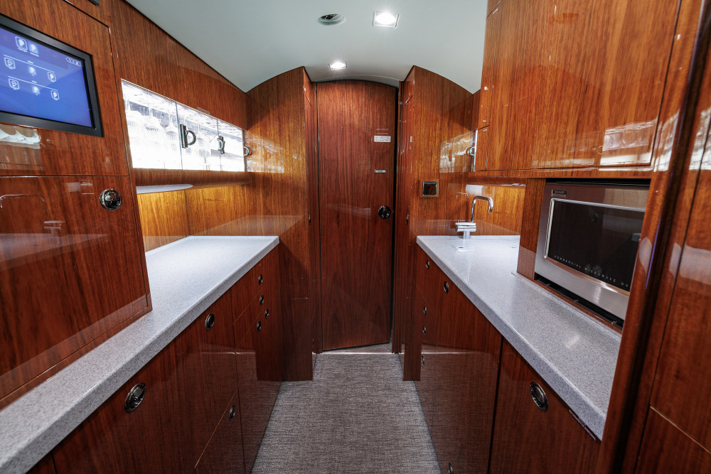 Aft Galley: High-temp oven, microwave oven, cooled food storage unit.