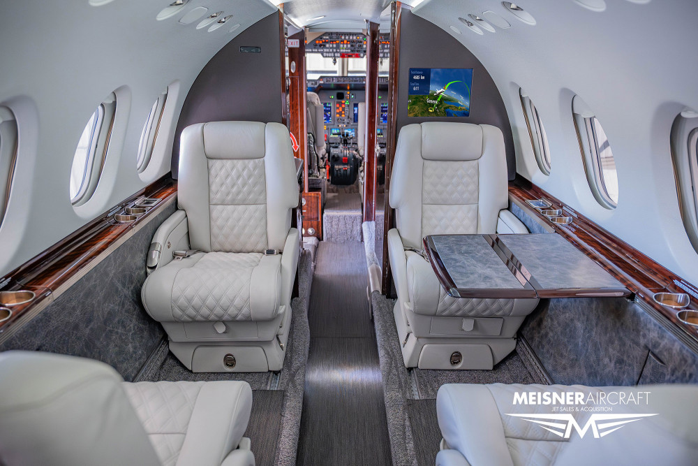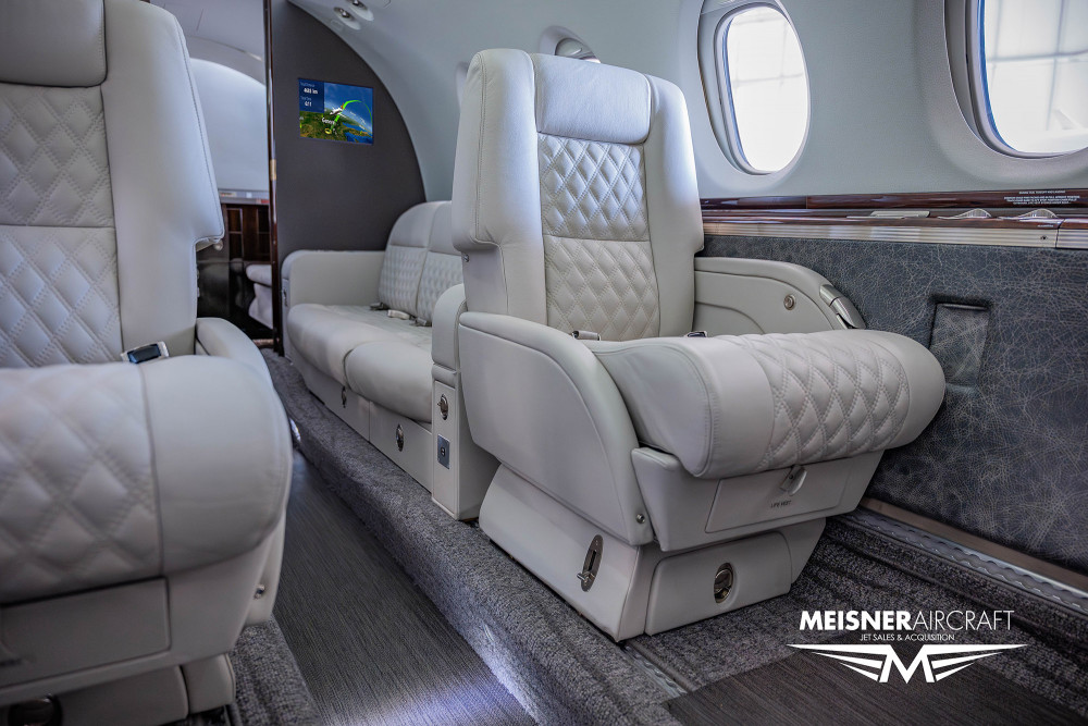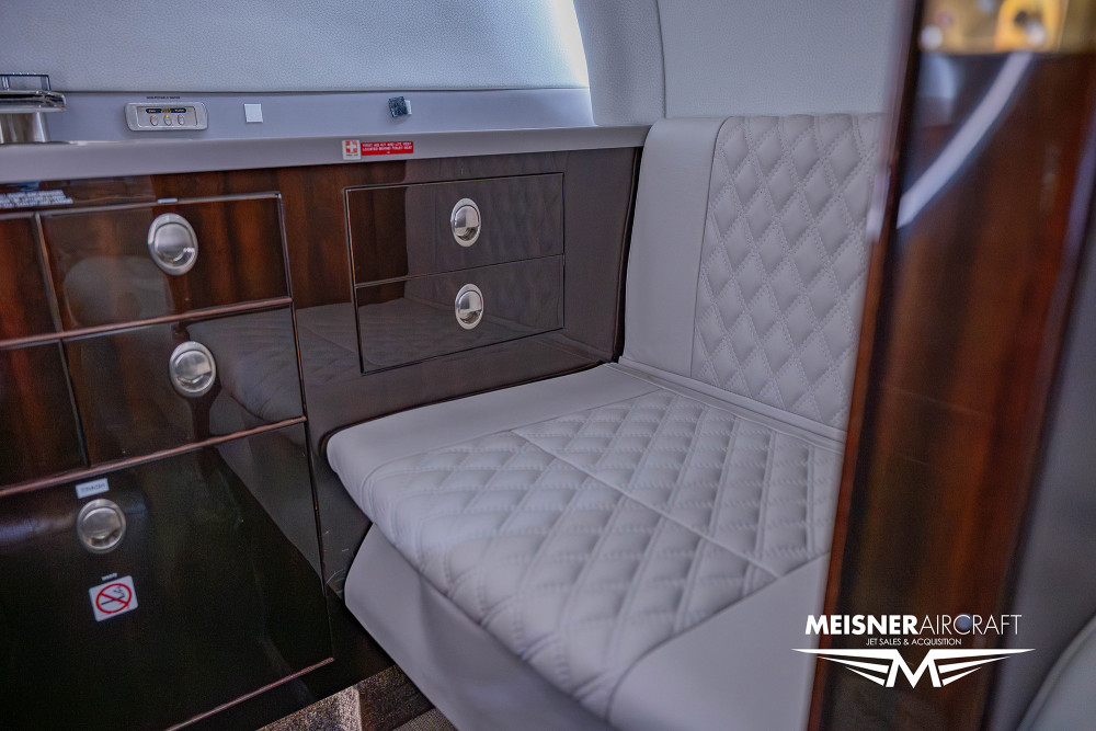 Executive nine (9) passenger interior including a belted lavatory seat. The cabin includes five (5) individual leather seats and a three (3) place divan. Four club chairs offer convenient under-seat storage drawers. The interior is finished with a Ultrasuede headliner and dual executive foldout tables. Amenities include 220-volt AC power outlets, drop-down inboard armrests at each individual seat, and a private aft lavatory with a hinged hardwood door. Entertainment is provided by two (2) 15” LCD screens—one located on the right-hand forward galley and the other on the left-hand aft bulkhead additionally displaying Airshow 4000 during flight.