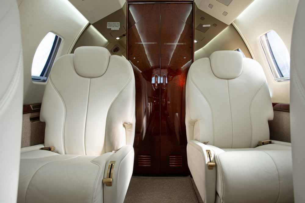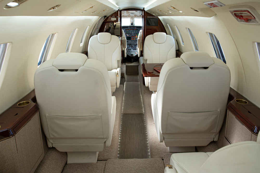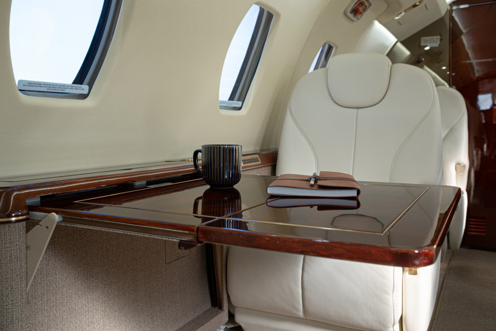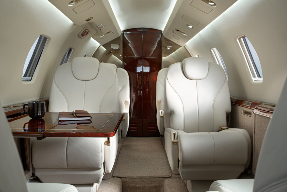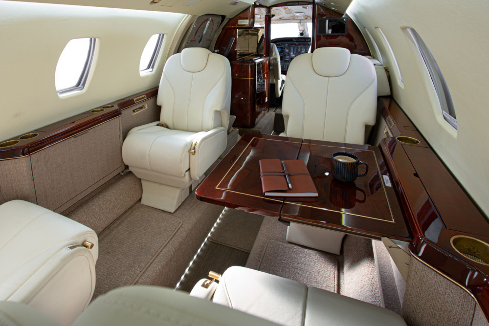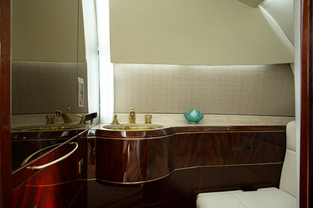Two executive tables and two aft tables. Aft left-hand belted flushing lavatory with sink and external service, aft right-hand storage cabinet