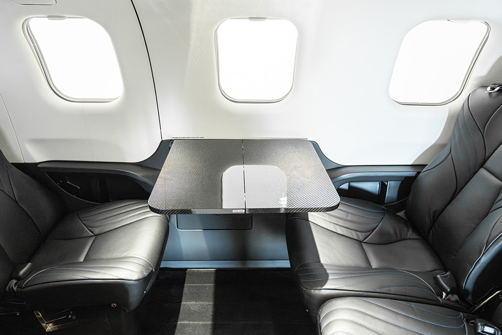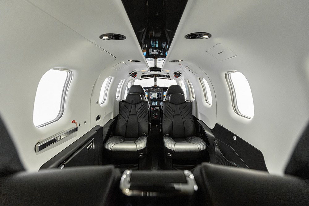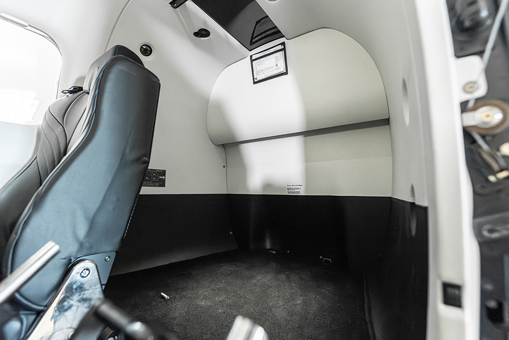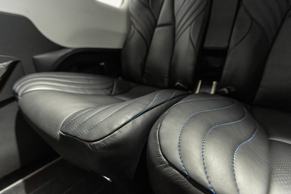 Six genuine black leather heated seats with adjustable backrests, folding armrests and intermediate seats with forward or backward accommodation with multiple installation configuration. Black lower side panels and carpet, White upper side panels and Flat Black metal finishes.