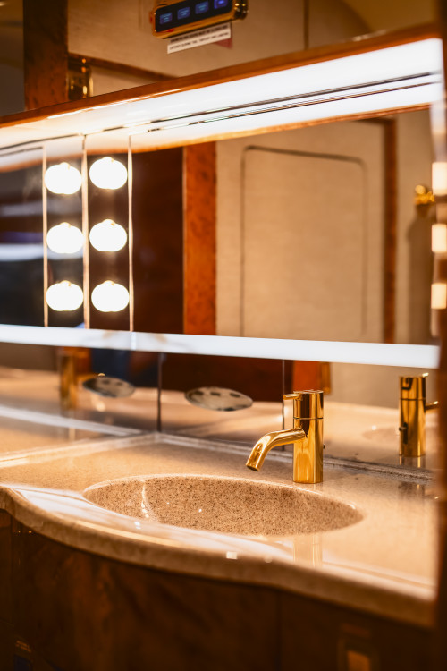 Forward crew lavatory with stowable sink assembly and Aft main passenger lavatory.
