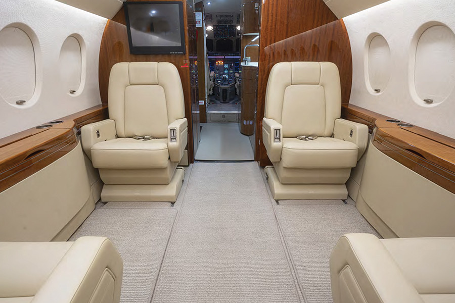 Fireblocked Eight (8) Passenger, Forward Galley & Extended Galley Annex Configuration. Features Magazine Rack, Tote Umbrella Installation (Entrance Door), Microwave, Mapco, Krups Coffee Maker, 18" Forward Bulkhead Rosen Monitor, Baker Public Address System.